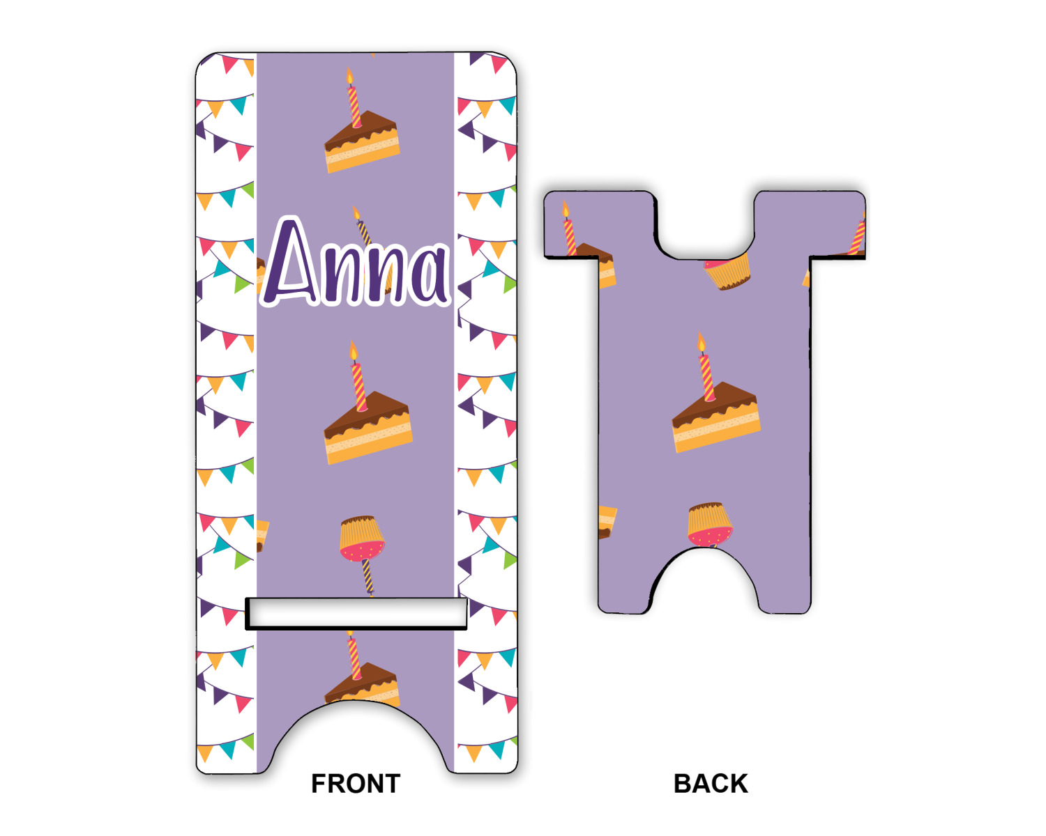 To meet your needs, we offer four variations of this IPhone stand. The backboard of the first version is shaped as a plain, yet sleek rectangle, and is available in two sizes. Our smaller size is approximately 4 by 3.25 by 7 inches, while the larger model is 4 by 3.77 by 8.5 inches. Alongside this model, we also provide you with a more decorative option. The upper part of our second version features a curved edge, for a classy, suave appearance. This phone holder is also sold in two sizes: a smaller version, which is 4 by 3.25 by 7 inches, and our larger model, which is 4 by 3.77 by 8.5 inches. Both models will support large phones, but the larger model is better if you wish to proudly display your personalized design.