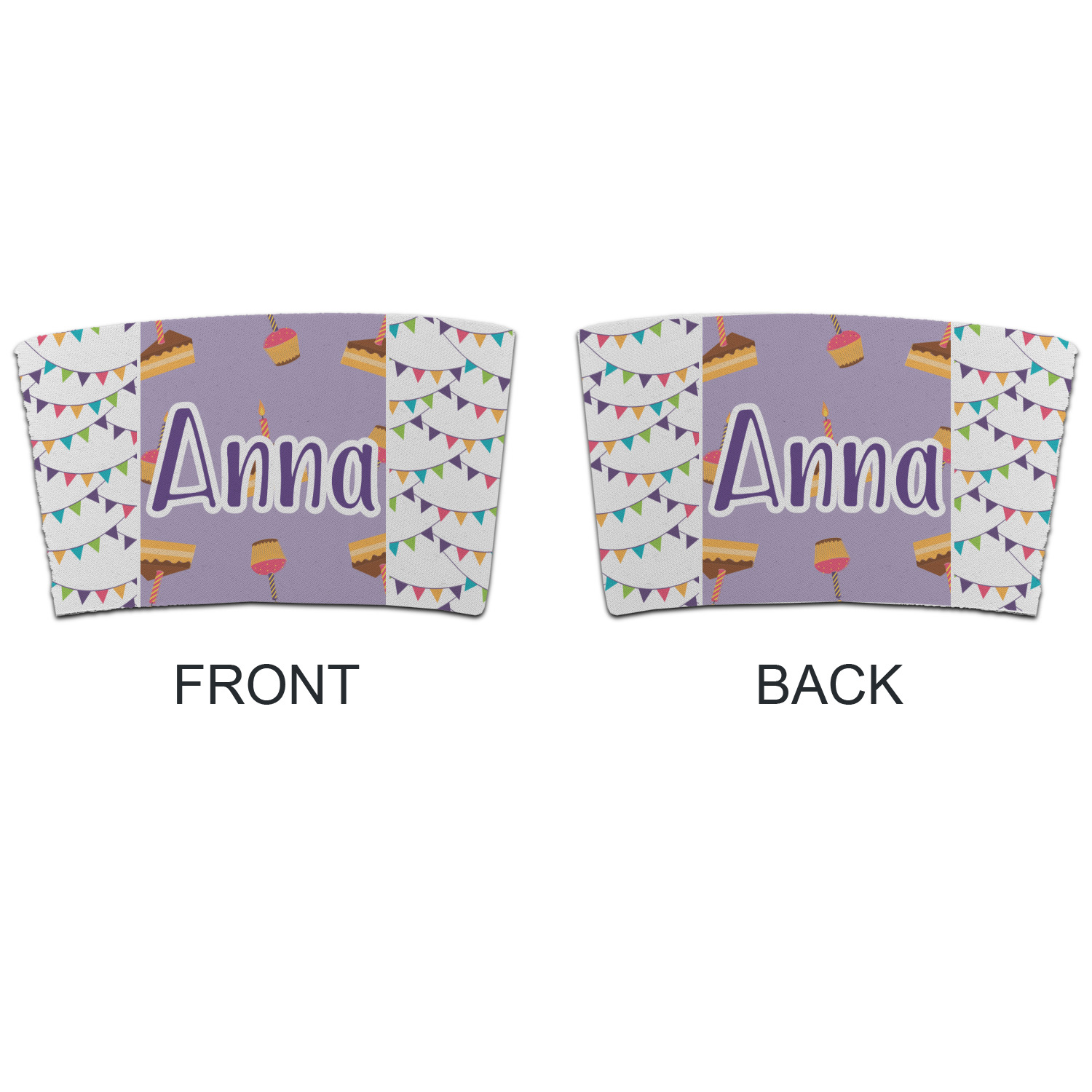 This design is filled with birthday party fun! The triangle birthday banners are a number of bright colors. Throughout the design you will find green, blue, yellow, pink, and mostly purple! The background is a fun lavender to contrast the pink cupcakes and yellow cake slices. This design in particular is divided up into three sections with two different patterns.