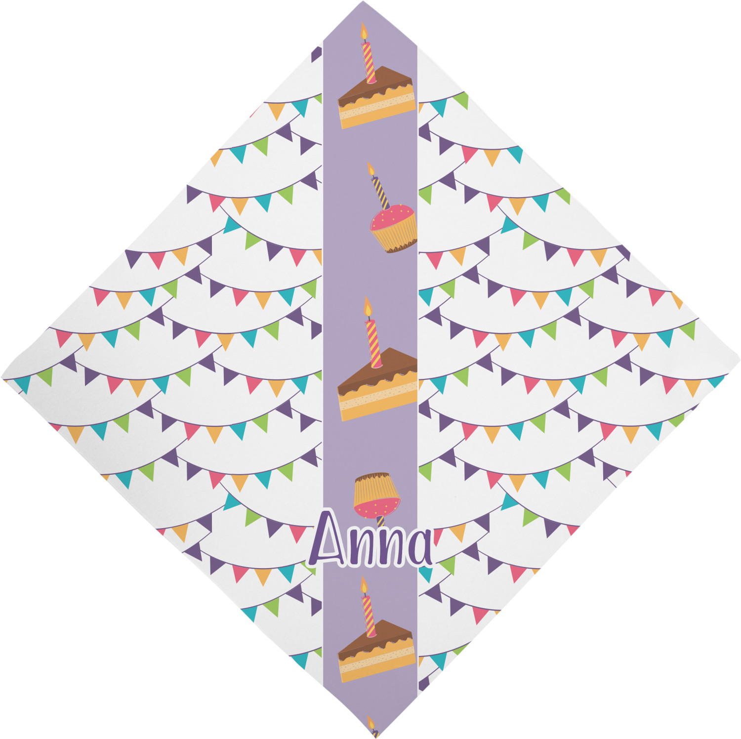 This design is filled with birthday party fun! The triangle birthday banners are a number of bright colors. Throughout the design you will find green, blue, yellow, pink, and mostly purple! The background is a fun lavender to contrast the pink cupcakes and yellow cake slices. This design in particular is divided up into three sections with two different patterns.