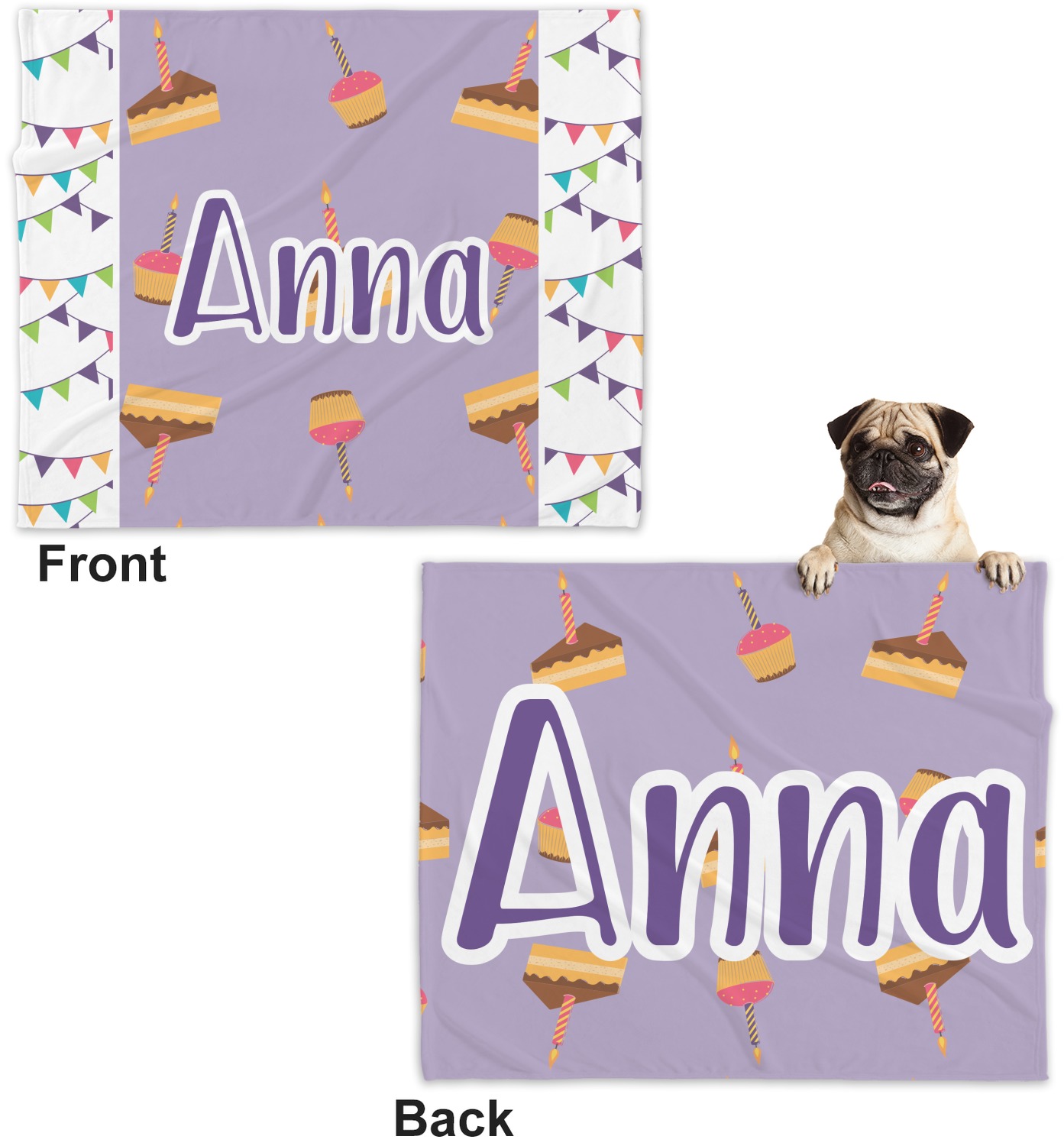 These dog blankets are crafted from a gentle, soft-to-the-touch, minky material. We print your customizations, either matching or differing, on both the top and underside of the blanket. These personalized dog blankets are available in two sizes: regular and large. Our regular size, at 40" x 30", accommodates small and some medium size dogs. At 60" x 50", our large dog blanket is a better fit for bigger breeds. Though specialized for dogs, these blankets still make a thoughtful gift for your favorite feline, or any other pet in mind!