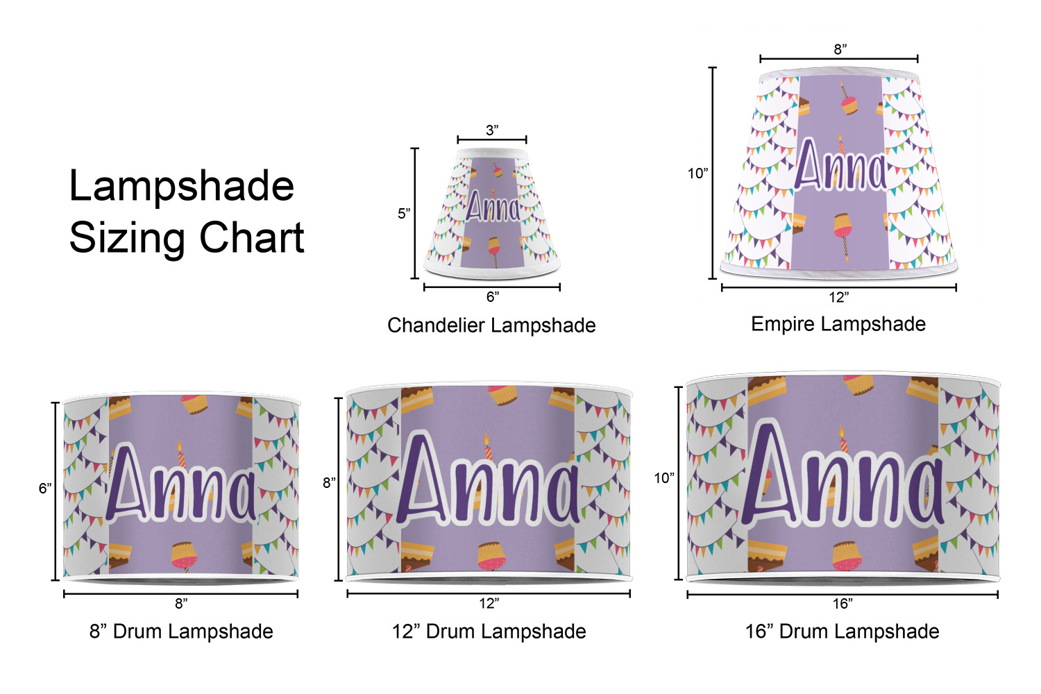 Our customized lamp shades also come in 3 different sizes: 8", 12" and 16", measuring at 8" in diameter by 6" tall, 12" in diameter by 8" tall, and 16" in diameter by 10" tall, respectively.