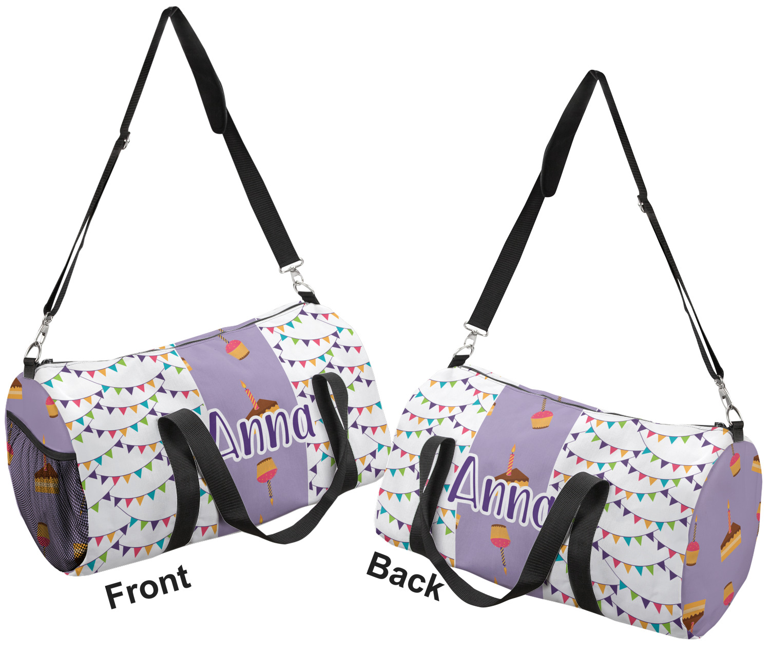 This duffle is a sturdy bag made of a canvas material. It comes in two sizes: Small (19"W x 9.5"H x 9.5"D) and Large (23"W x 12"H x 12"D). The bag is a cylindrical shape with a black adjustable strap and two handles. On one side is an elastic pouch to put a waterbottle or other small item. Your product will be sublimated with your design and is able to be designed on the front, back, and sides. Be sure to remember that the straps may cut into parts of your design if you upload your own artwork.