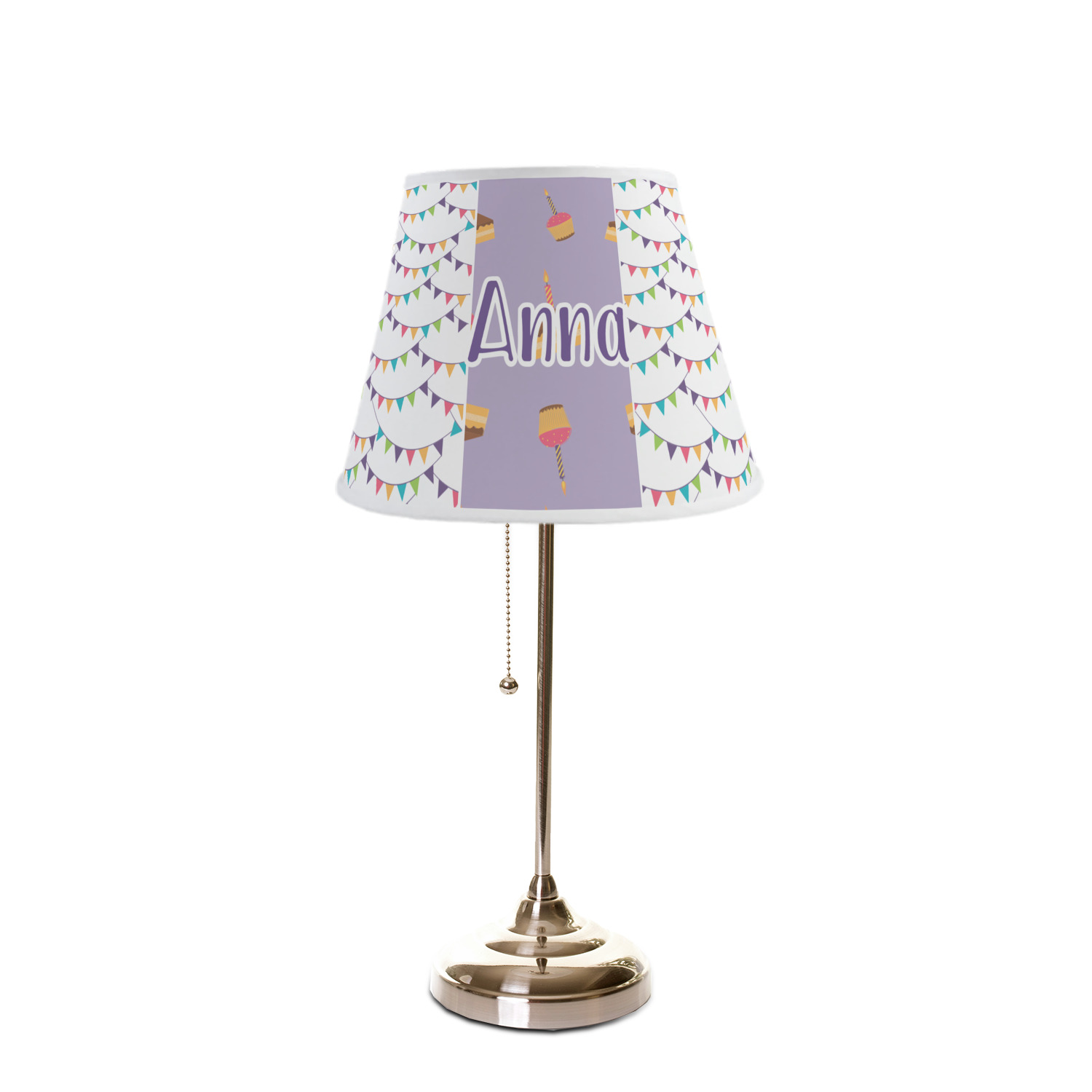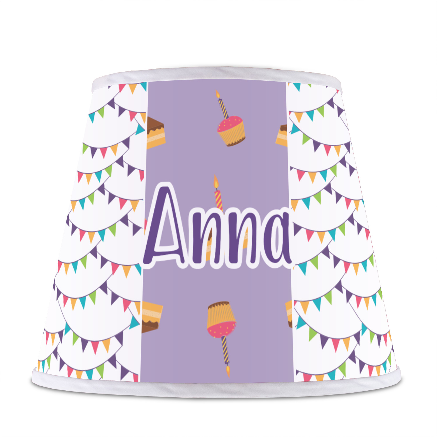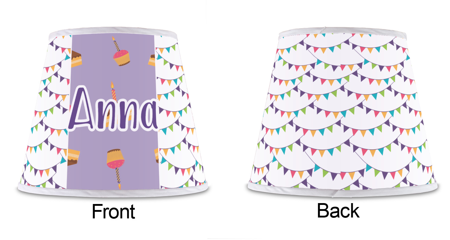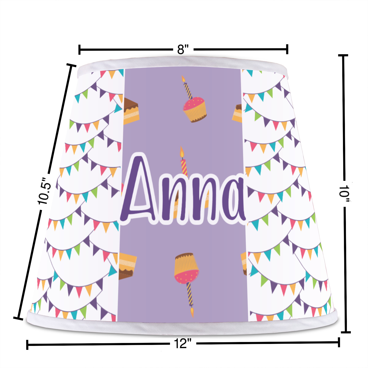 The base of this lampshade is 12 inches in diameter, and the top spans 8 inches in diameter. The total height of the lampshade is 10 inches. The angled nature of this custom lampshade concentrates the light, making it ideal for smaller spaces. This lampshade is made of matte, polyfilm, and displays your customization in its middle. The top and bottom of this colorful lamp shade are lined with a white fabric ribbon (which can be replaced with black inside the design studio) which frames your design and creates a sophisticated finish. As an UNO fitter lampshade, this unique lamp shade will fit a variety of bases.