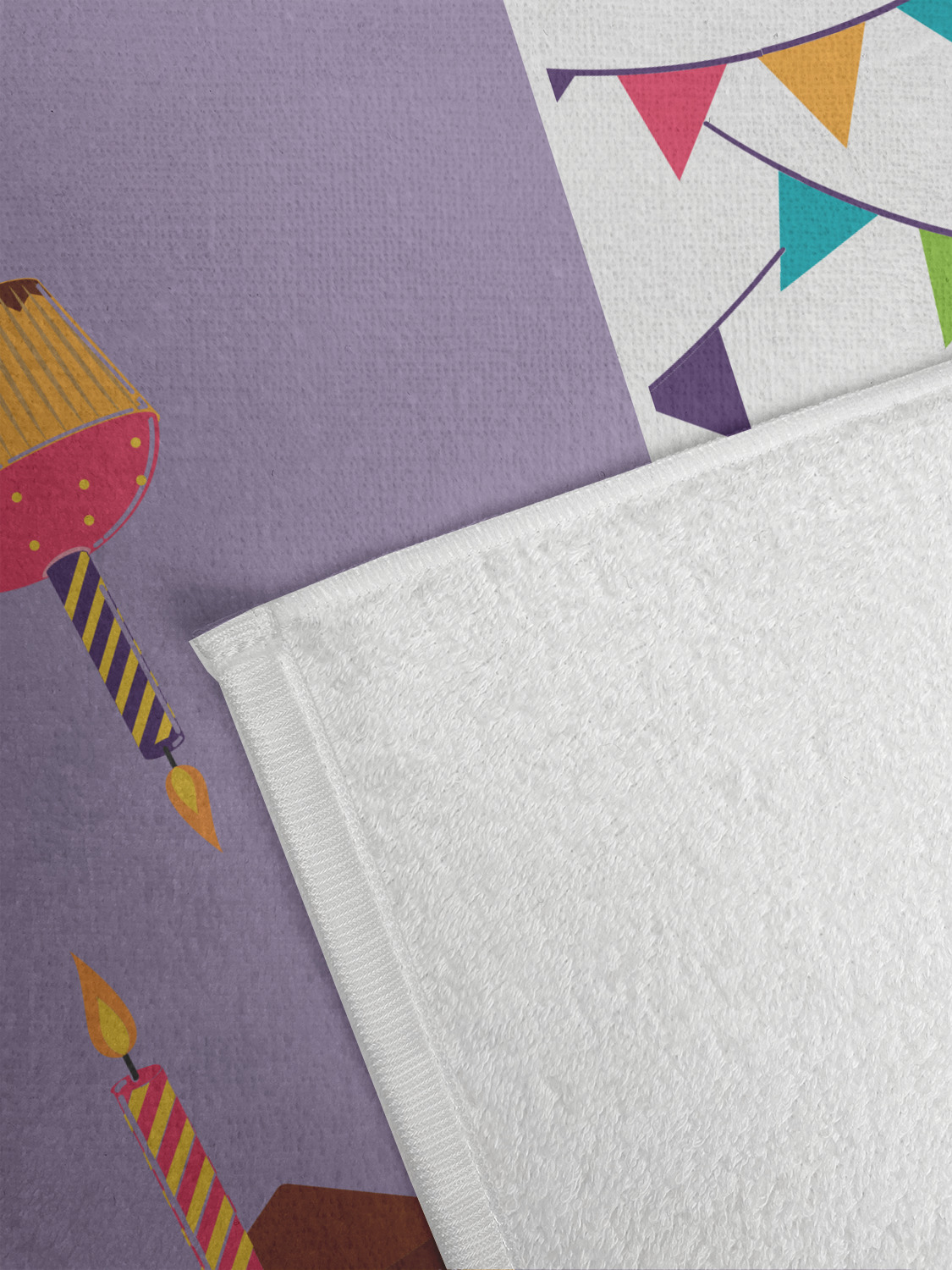 This design is filled with birthday party fun! The triangle birthday banners are a number of bright colors. Throughout the design you will find green, blue, yellow, pink, and mostly purple! The background is a fun lavender to contrast the pink cupcakes and yellow cake slices. This design in particular is divided up into three sections with two different patterns.