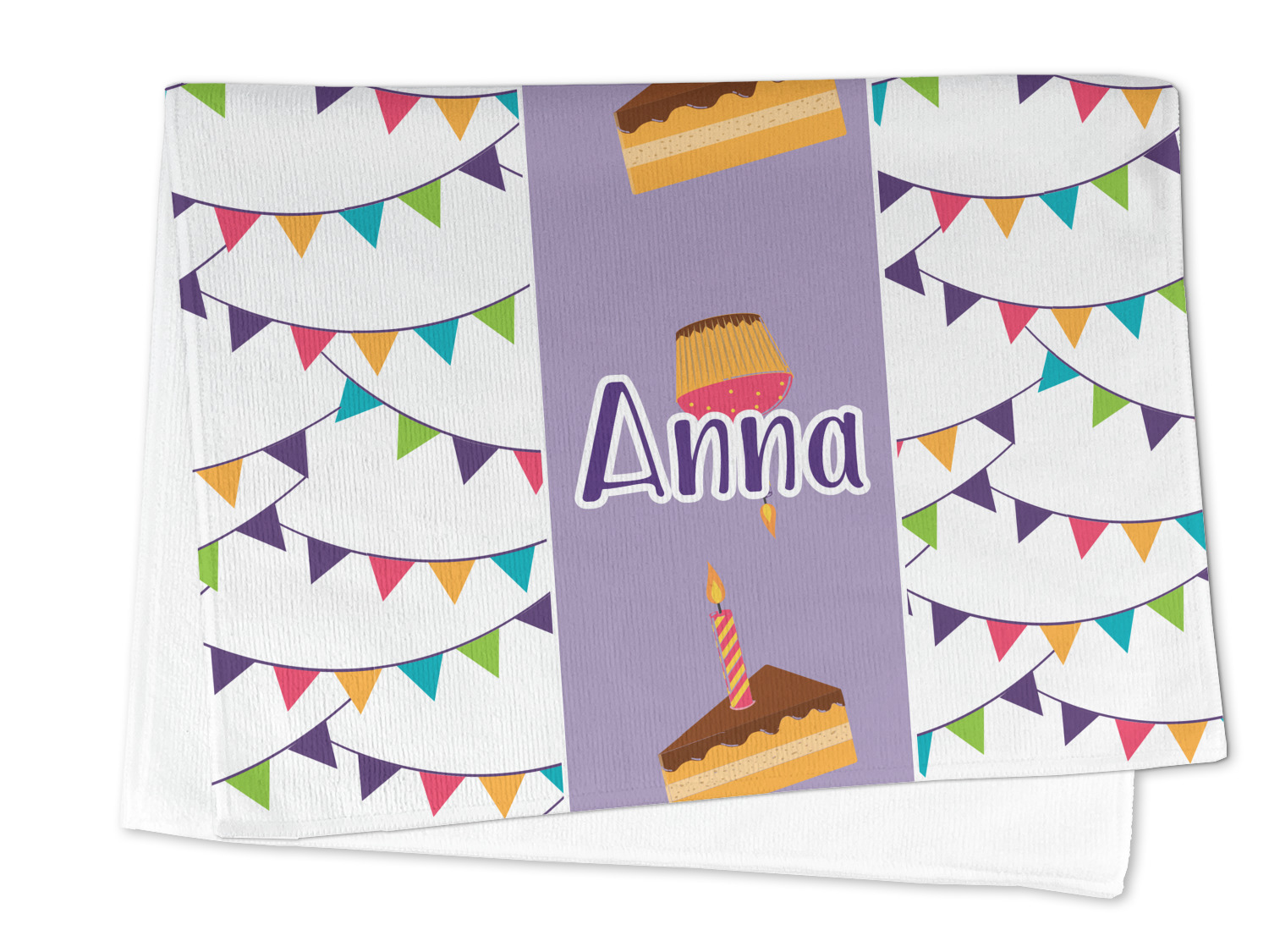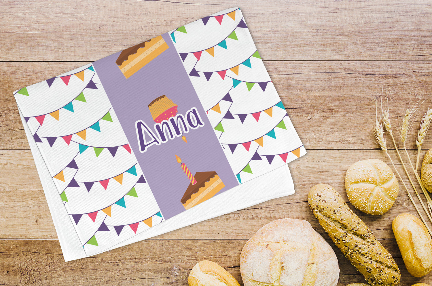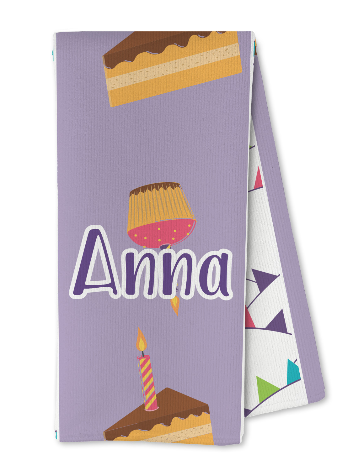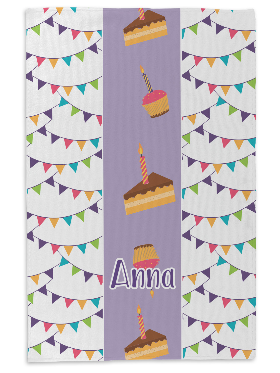 This design is filled with birthday party fun! The triangle birthday banners are a number of bright colors. Throughout the design you will find green, blue, yellow, pink, and mostly purple! The background is a fun lavender to contrast the pink cupcakes and yellow cake slices. This design in particular is divided up into three sections with two different patterns.