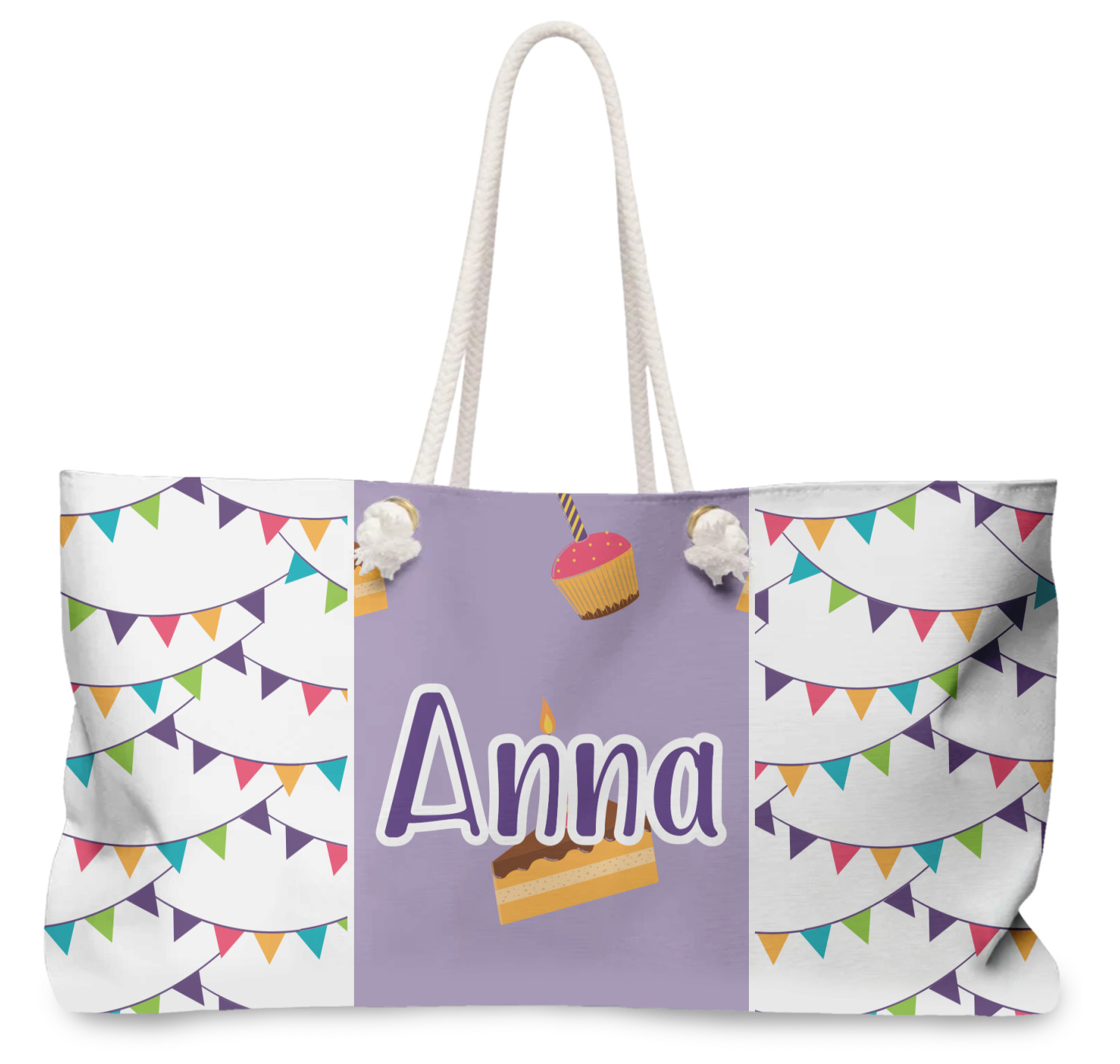 Our oversized weekender tote with rope handles is perfect for your weekend at the beach or on the town. This large tote are 24" W X 13" H, with a 5" gusset and a 27" thick rope handles with a knot that is put through a grommeted brass hole.