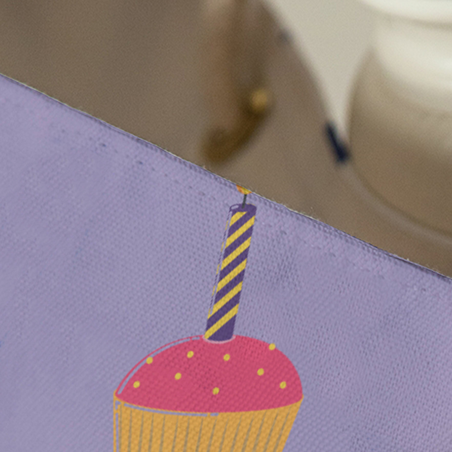 This design is filled with birthday party fun! The triangle birthday banners are a number of bright colors. Throughout the design you will find green, blue, yellow, pink, and mostly purple! The background is a fun lavender to contrast the pink cupcakes and yellow cake slices. This design in particular is divided up into three sections with two different patterns.