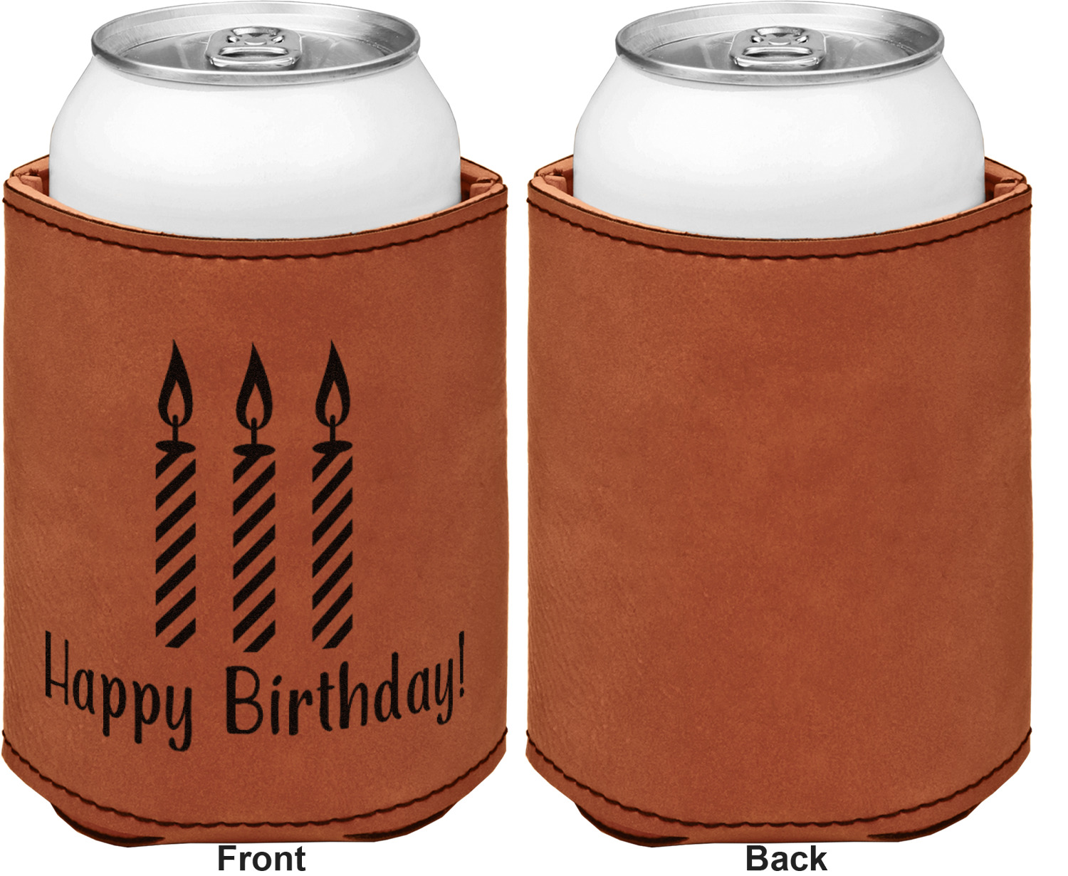 This can sleeve is made from a cognac-brown leatherette and stitched with a sturdy, black thread. A slim padding lines the inside of your can sleeve to allow for a better fit once your drink is inserted. The sleeve itself measures at 4 by 4.5 inches, allowing this custom can sleeve to accommodate most canned drinks. Your personalized design can be engraved on the front and back, or solely the front. When laser-engraved, your design appears as a black coloration which contrasts the leatherette nicely.