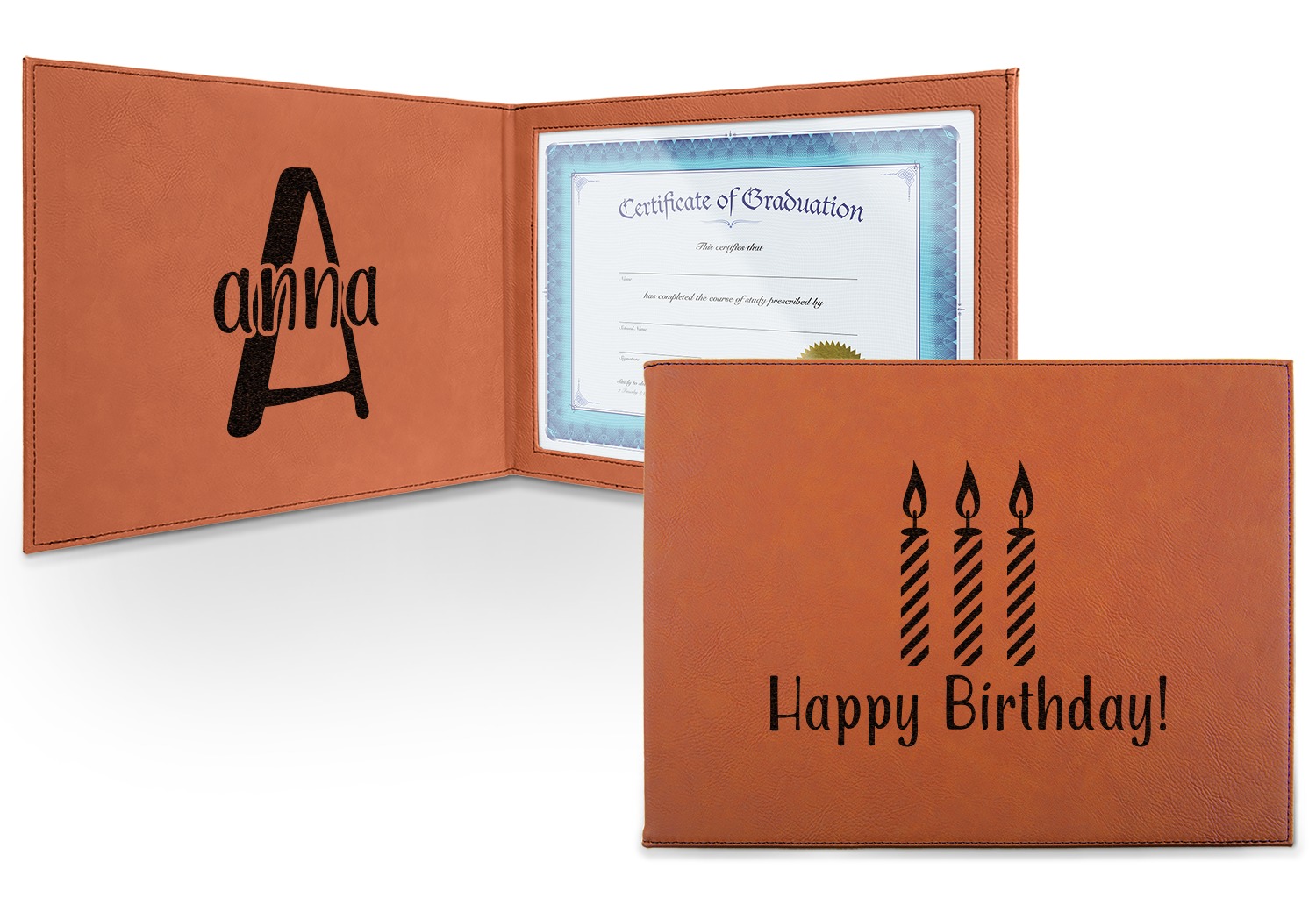 This cognac-colored, leatherette certificate jacket is the ideal way to display or store your hard-earned certificate. When closed, the custom certificate holder measures at 12 by 9 inches. The interior of the certificate cover includes a clear, vinyl window to encase your diploma. The window measures at around 10.5 by 7.5 inches and can accommodate a diploma that measures at up to 8.5 by 11 inches. You can either choose to have your customization laser engraved on the front and interior, or solely the front.