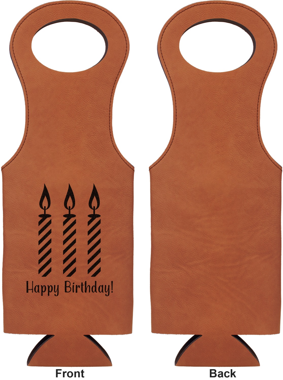 This wine carrier is made from a stunning leatherette, in a cognac-brown color. Strong, black stitching lines the sides of your wine bottle bag and provides extra durability. The interior is lined with a padded, black material to allow for a snug fit once your bottle is placed inside. At the top of this wine gift bag, you'll find two oval shaped handles that elegantly complements the rest of the bag's style. We provide you with the option of laser-engraving the front, or the front and back of your new personalized wine bag!
