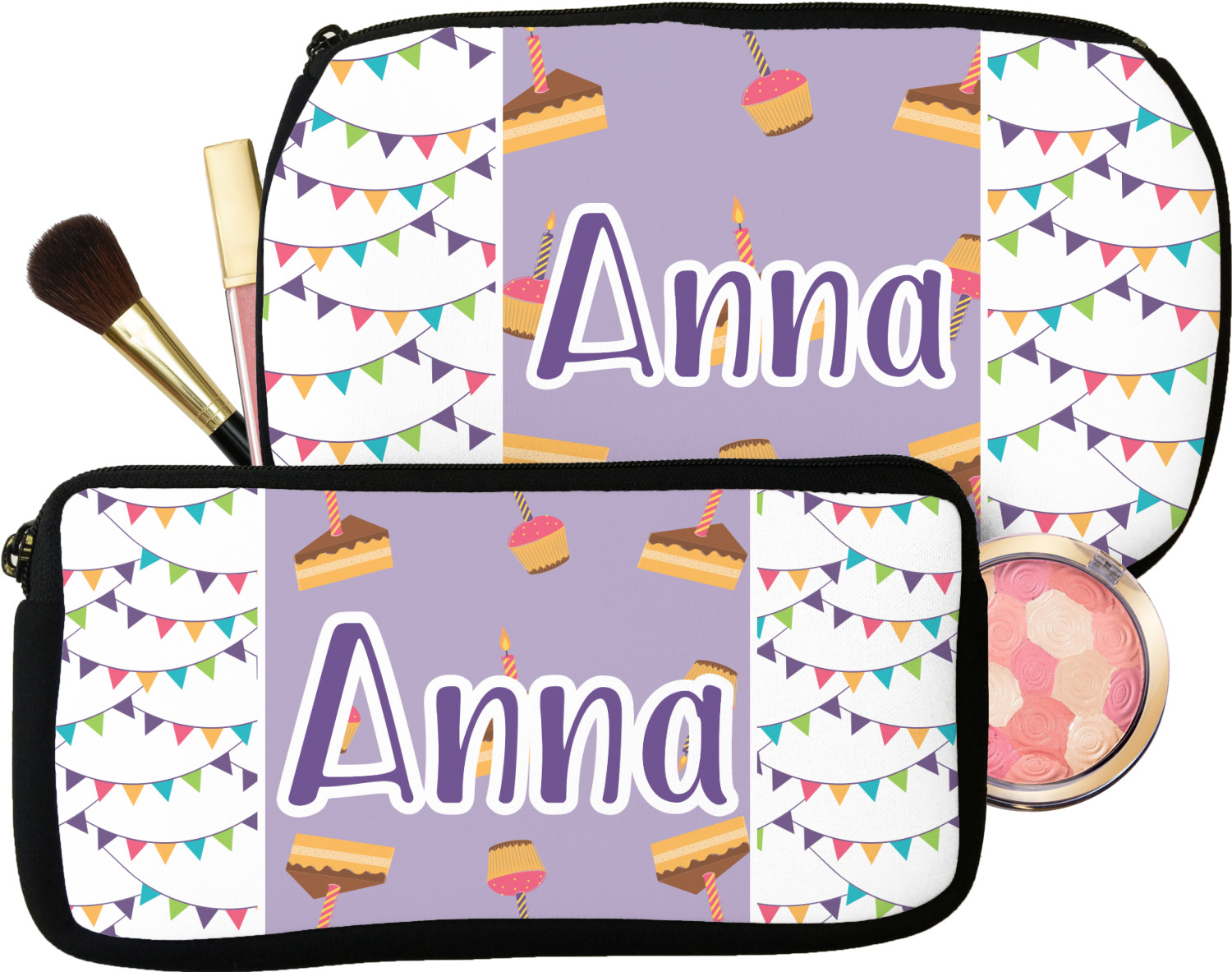 Our personalized makeup bags are available in many different designs, patterns and colors - so you are sure to find one that will love. They are made of neoprene (same material as wet-suits) and thus are water resistant, so spillages in your makeup bag will not end up all over you purse. They are customized on one side and are black on the other side and the zipper is black as well.