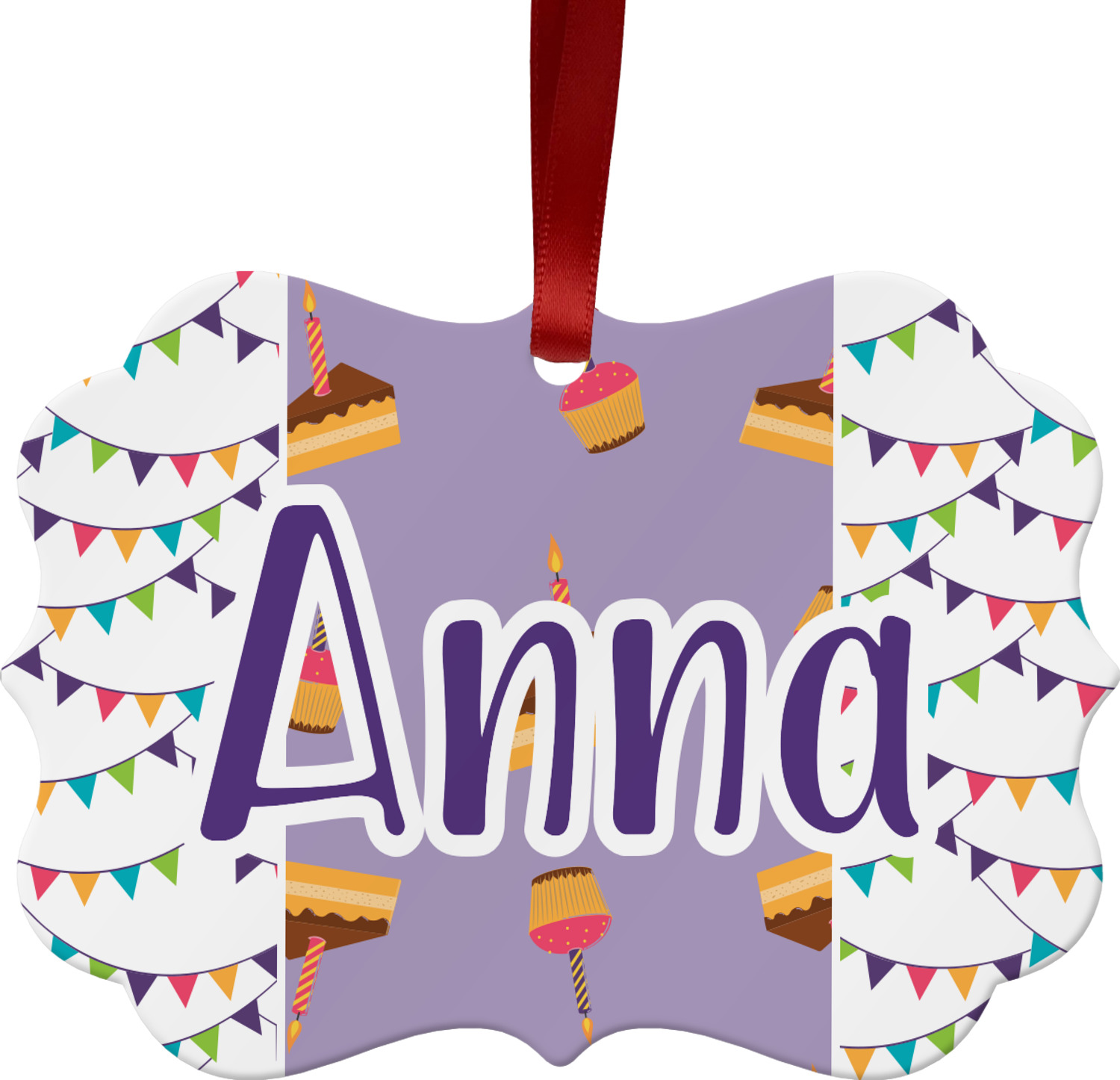 This design is filled with birthday party fun! The triangle birthday banners are a number of bright colors. Throughout the design you will find green, blue, yellow, pink, and mostly purple! The background is a fun lavender to contrast the pink cupcakes and yellow cake slices. This design in particular is divided up into three sections with two different patterns.