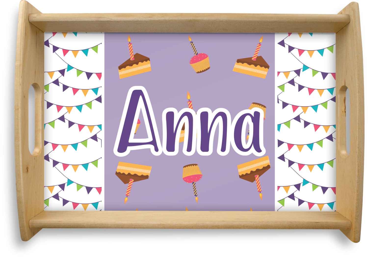 This serving tray with handles features square edges and two rounded sides, creating a very modern look. Each side is fabricated from a beautifully cut, natural wood. The bottom of the interior of the tray displays your customized design in bright, vibrant color. The tray is sold in both a black color and a natural wood look. Each variation of the wood serving tray has two sizes: Small, which is 14" x 10" x 2.25", and Large, which is 19.5" x 13.5" x 2.75".