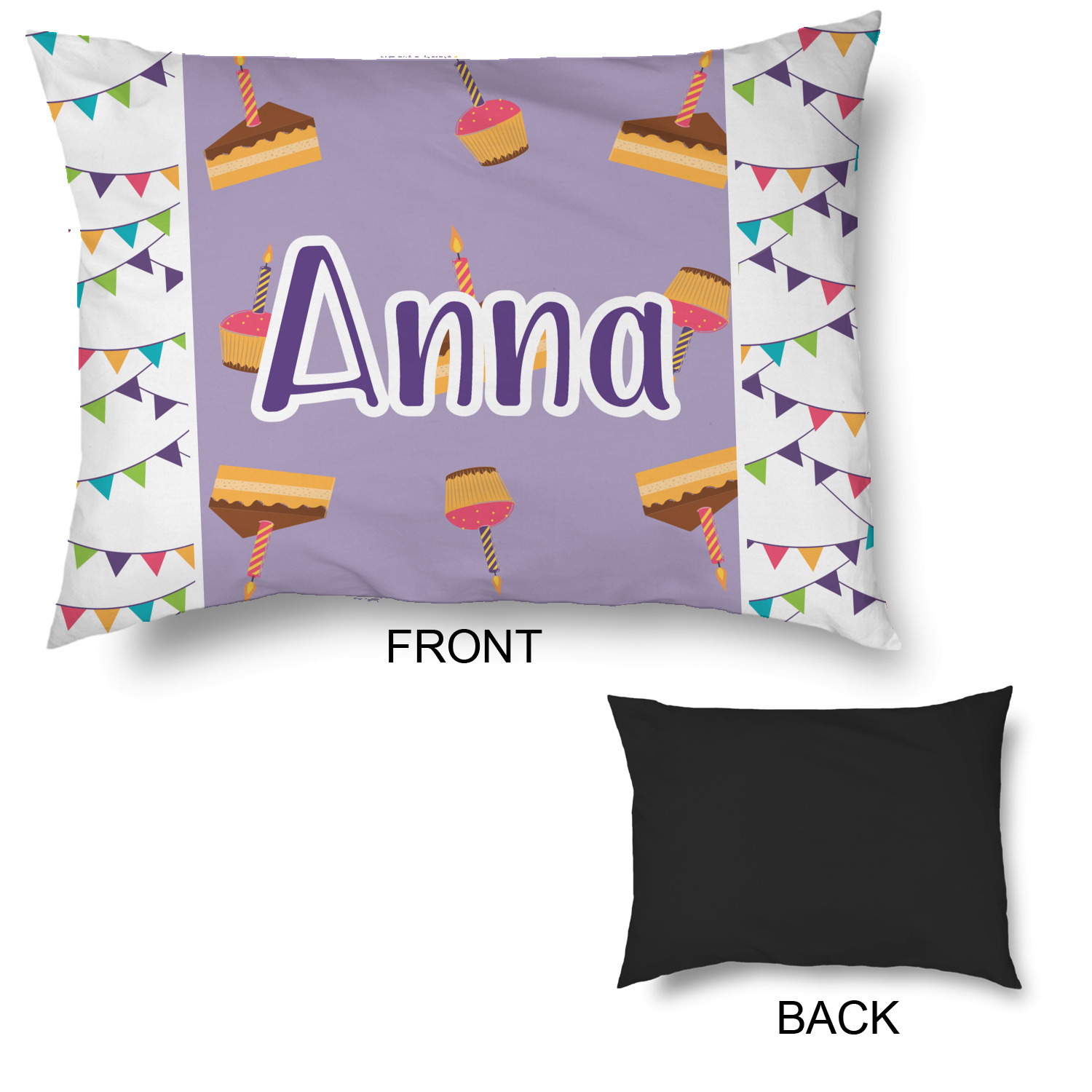 This design is filled with birthday party fun! The triangle birthday banners are a number of bright colors. Throughout the design you will find green, blue, yellow, pink, and mostly purple! The background is a fun lavender to contrast the pink cupcakes and yellow cake slices. This design in particular is divided up into three sections with two different patterns.