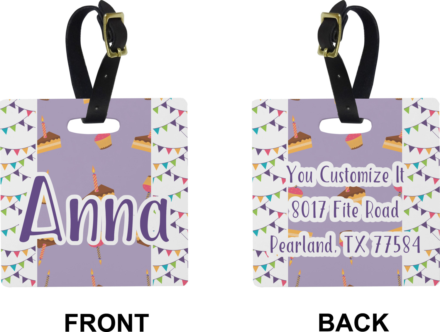 These personalized bag tags are sold in a variety of shapes, so that you may find the product that meets your vision exactly. We sell a round luggage tag, which measures at approximately 4" x 4". Our square luggage tag is about 3.5" x 3.5", while our rectangular version is 2.75" x 4 ".