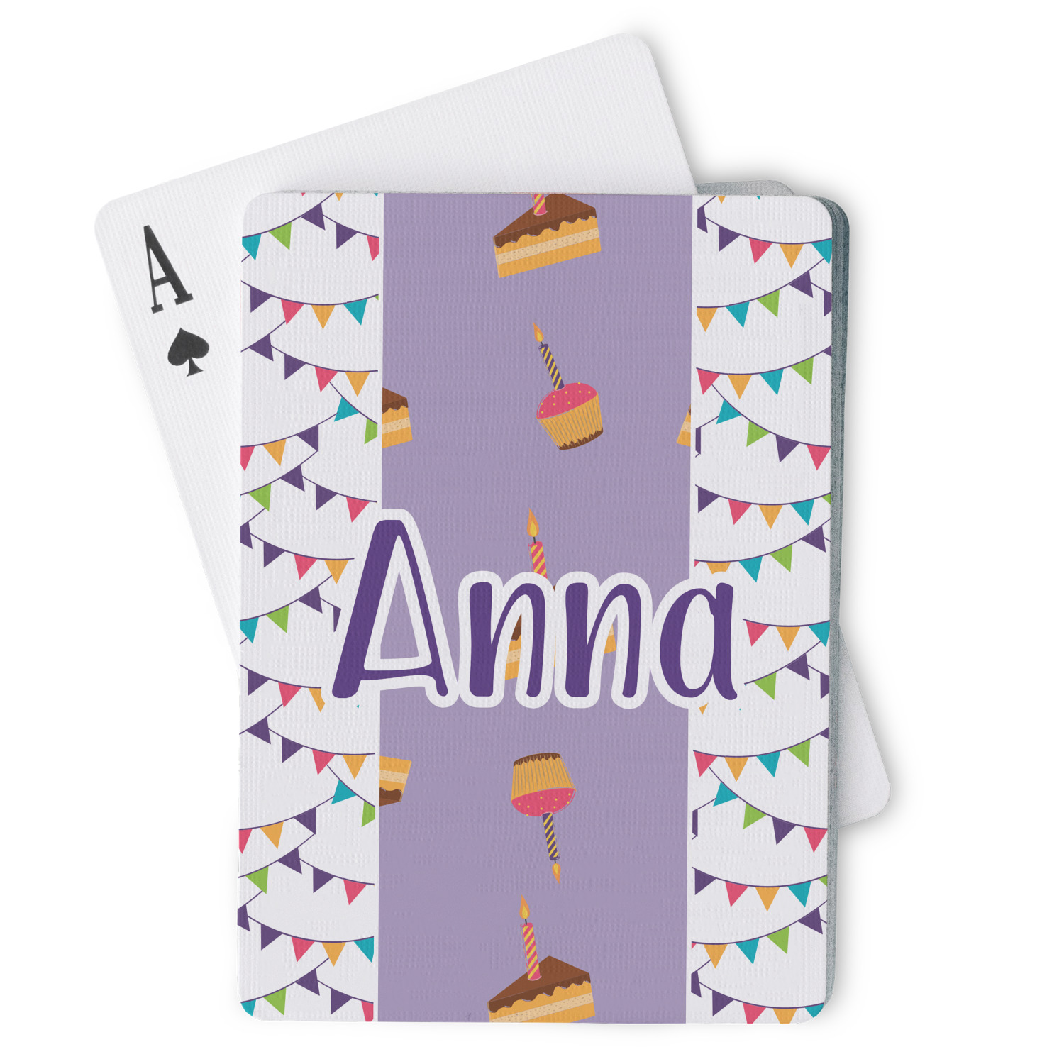 The customization / personalization is printed on the back side. The playing cards have a low gloss coating on both sides. The cards are packaged in a clear plastic box.