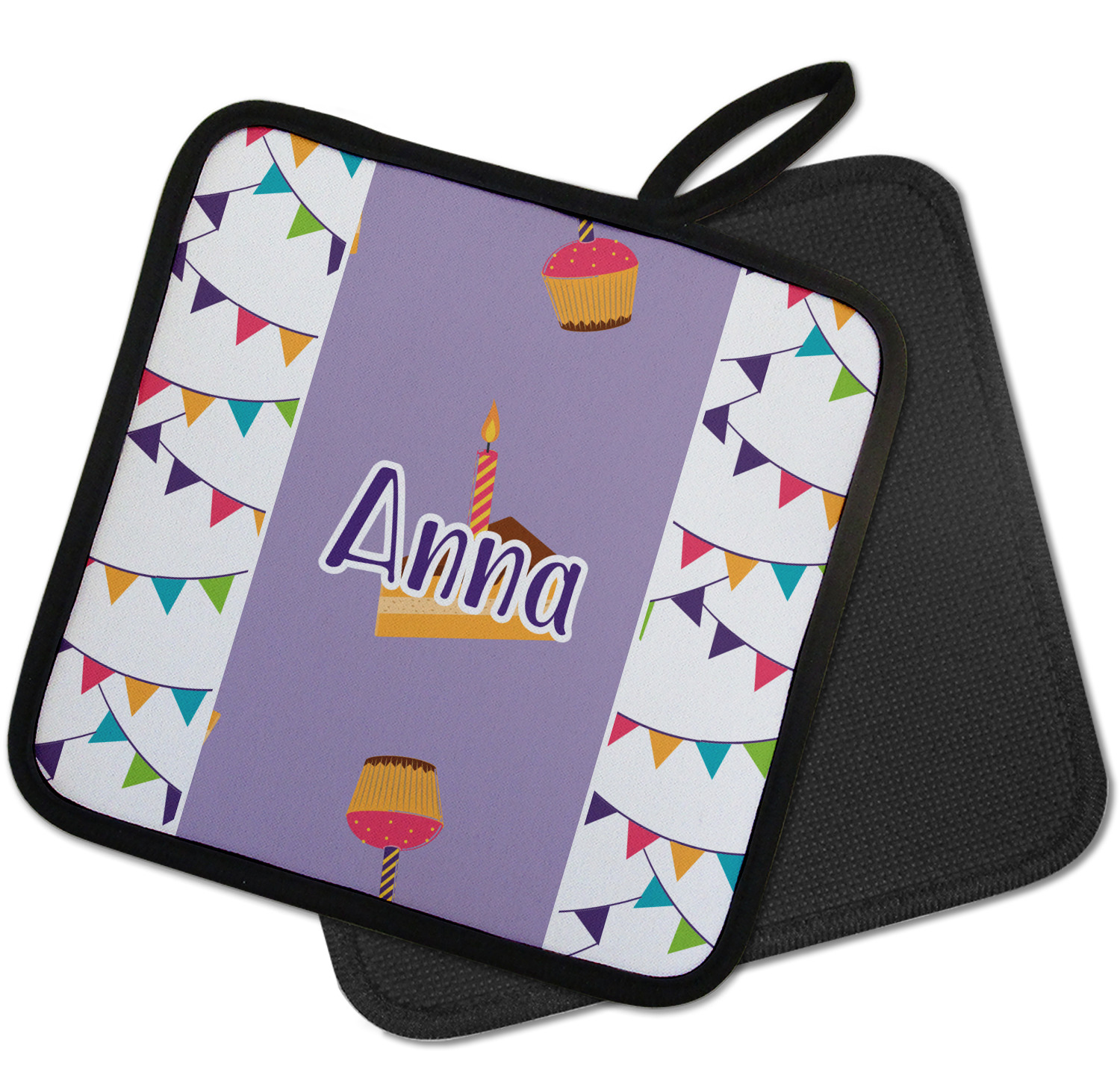 Our personalized pot holders feature a neoprene front that displays your personalization in vibrant colors. The backing of the hot pot holder is rubberized; the textured backing allows you to have a great grip when using this custom pot holder. The two materials are joined with a sleek, black trim, and the holder also includes an attached loop for hanging and storage. The pot holder is approximately 8.75 inches by 8.75 inches and 0.25 inches tall, while the fabric loop is 2.5 inches long. You can purchase a kitchen pot holder by itself or as a set of 2. We also offer a set including one pot holder and one oven mitt.