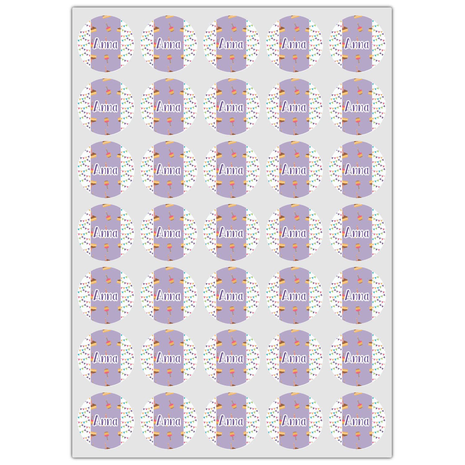 This design is filled with birthday party fun! The triangle birthday banners are a number of bright colors. Throughout the design you will find green, blue, yellow, pink, and mostly purple! The background is a fun lavender to contrast the pink cupcakes and yellow cake slices. This design in particular is divided up into three sections with two different patterns.