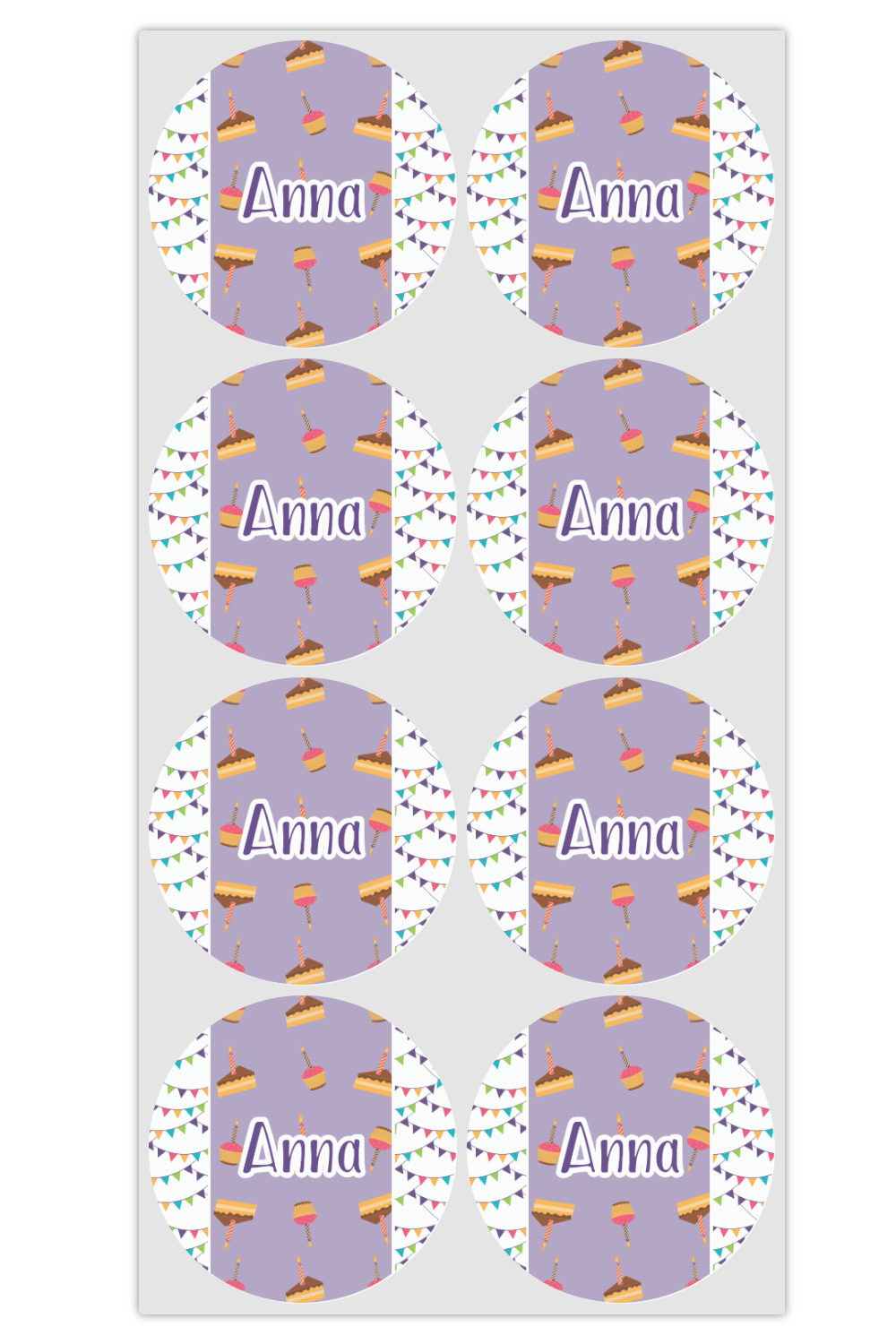 This design is filled with birthday party fun! The triangle birthday banners are a number of bright colors. Throughout the design you will find green, blue, yellow, pink, and mostly purple! The background is a fun lavender to contrast the pink cupcakes and yellow cake slices. This design in particular is divided up into three sections with two different patterns.