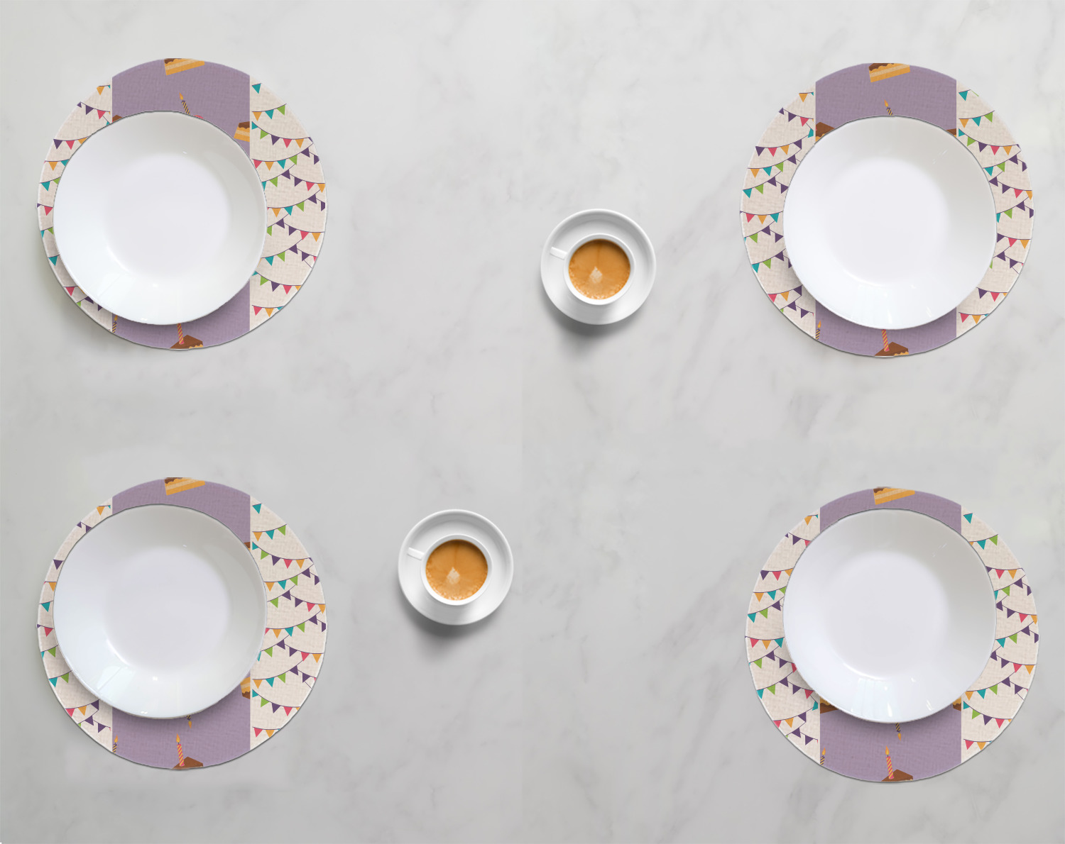 This design is filled with birthday party fun! The triangle birthday banners are a number of bright colors. Throughout the design you will find green, blue, yellow, pink, and mostly purple! The background is a fun lavender to contrast the pink cupcakes and yellow cake slices. This design in particular is divided up into three sections with two different patterns.