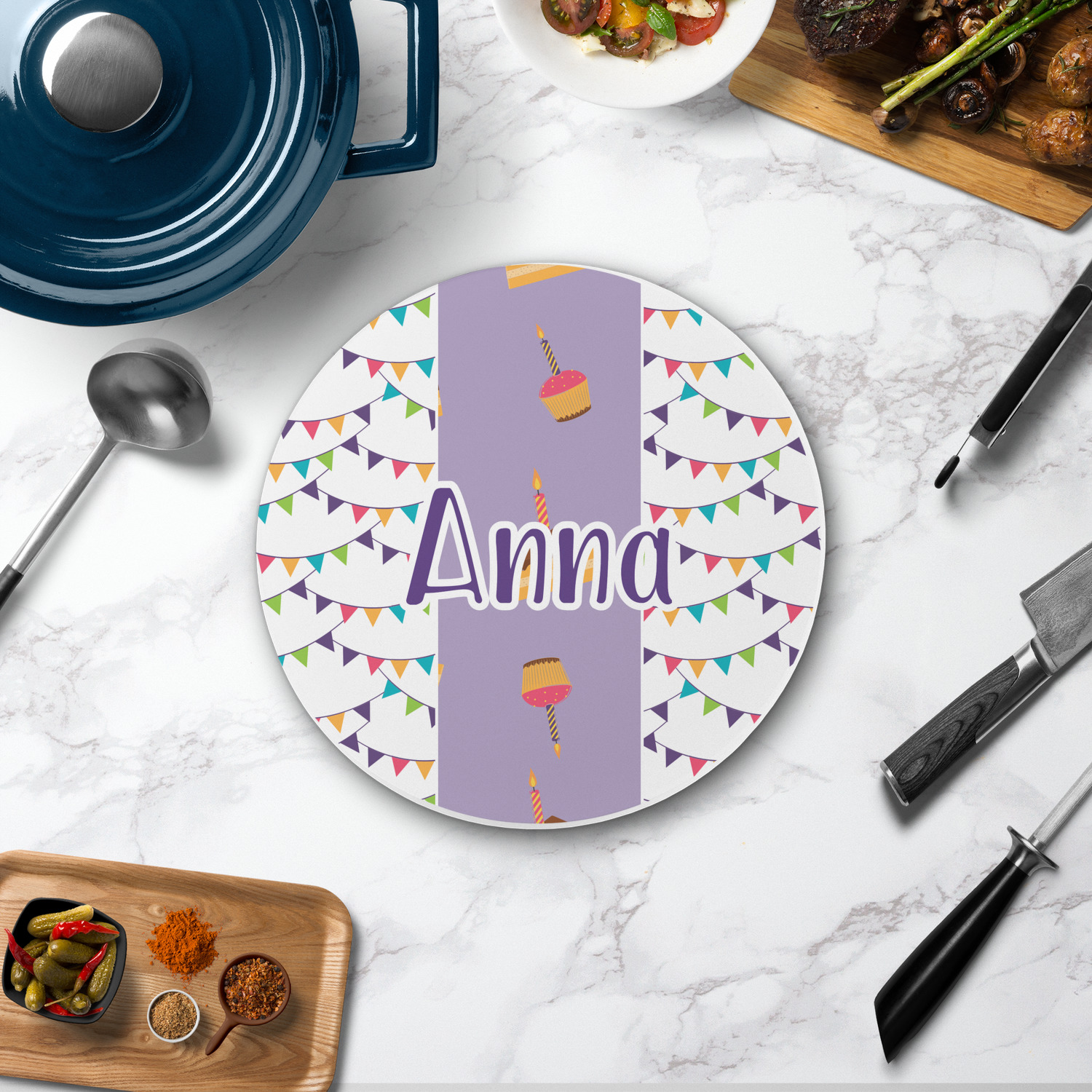 The round trivets can be customized with your own design, your own photo, or your own logo. You can add personalization, like a monogram, family name or initial to your uploaded design / art. You can also customize one of our designs and change the patterns, colors, personalization, fonts etc.