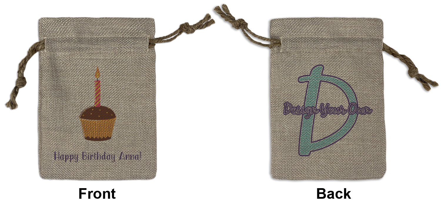 We sell our Burlap Gift Bags in 3 variant sized bags. Made with burlap polyester, each personalized bag can be secured with a twine drawstring pull. Your custom design is available to print on one side or both sides - completely up to you! The sizes of the bags measure approximately 4.5" x 6.5" for the smallest size, 6.5" x 8.0" for the medium size, and 6.5" x 13.5" for the large-sized bag.
