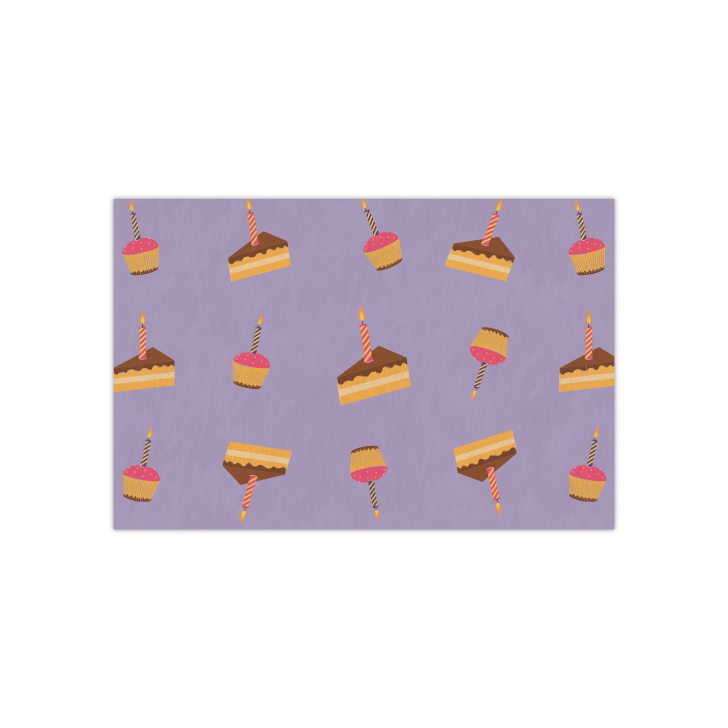 This design is filled with birthday party fun! The triangle birthday banners are a number of bright colors. Throughout the design you will find green, blue, yellow, pink, and mostly purple! The background is a fun lavender to contrast the pink cupcakes and yellow cake slices. This design in particular is divided up into three sections with two different patterns.