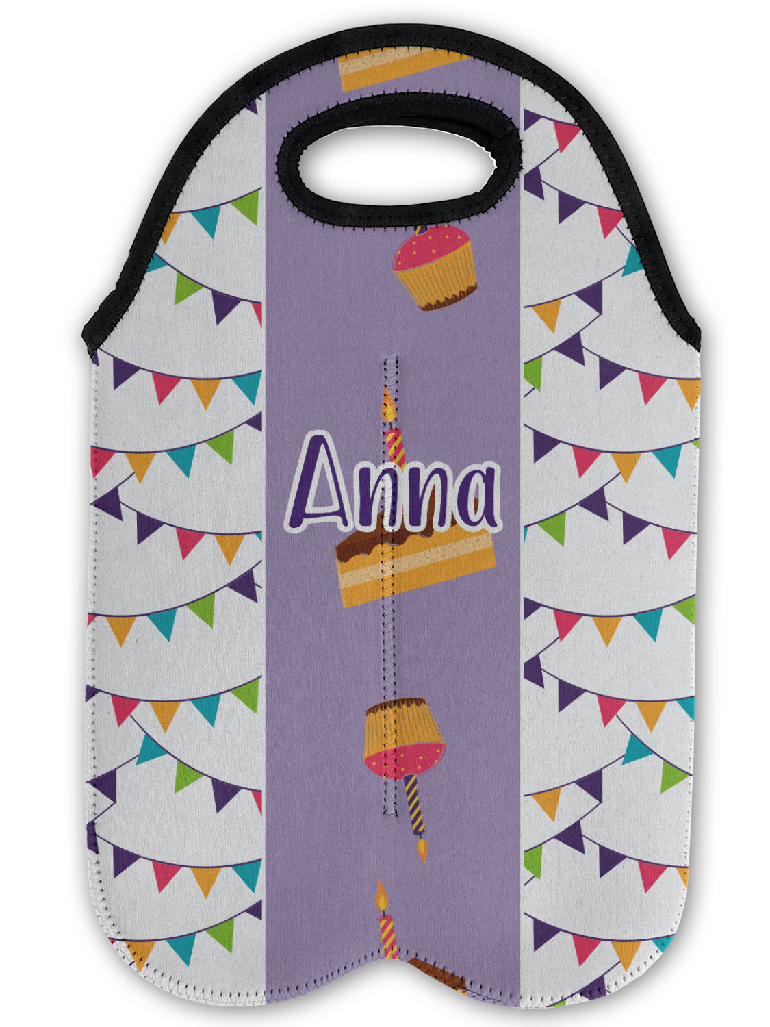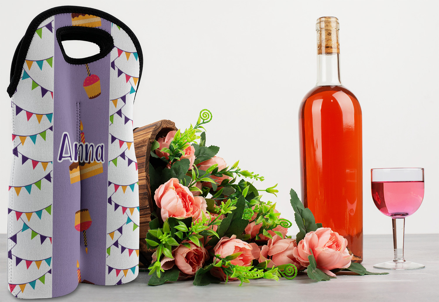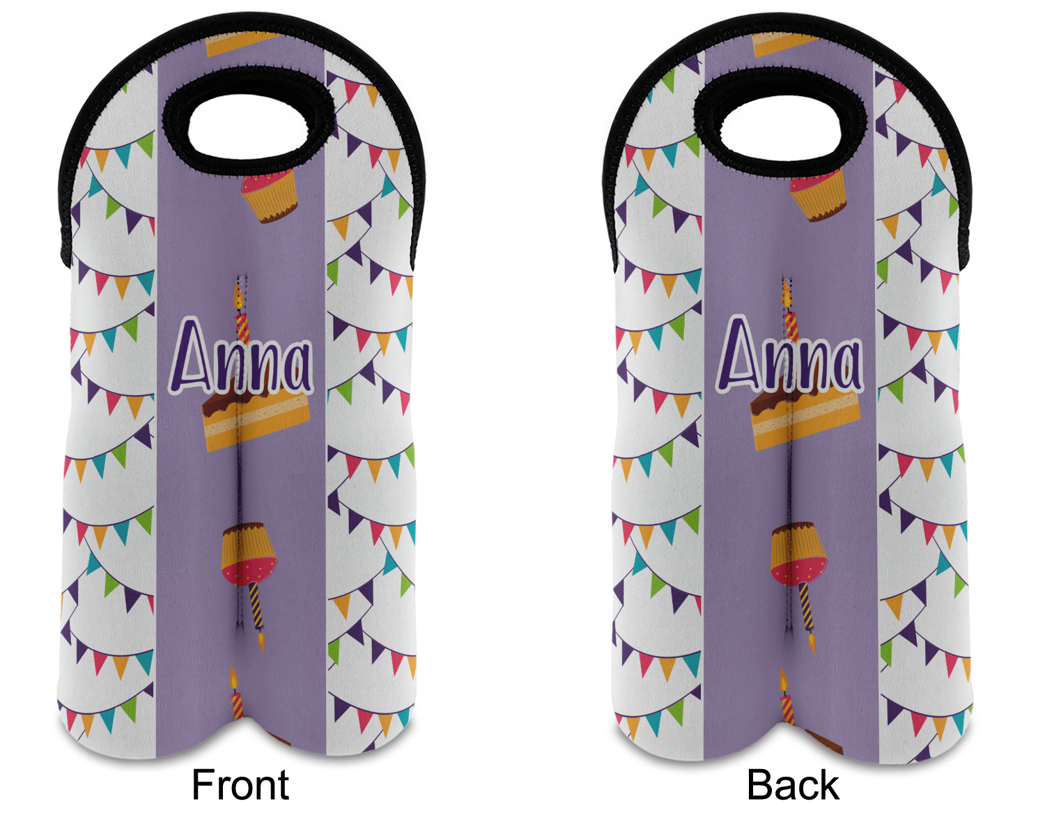 These tote bags are insulated to keep the bottles cold and have a stitched separation down the middle and double handles to keep the two bottles safe and secure during travels.