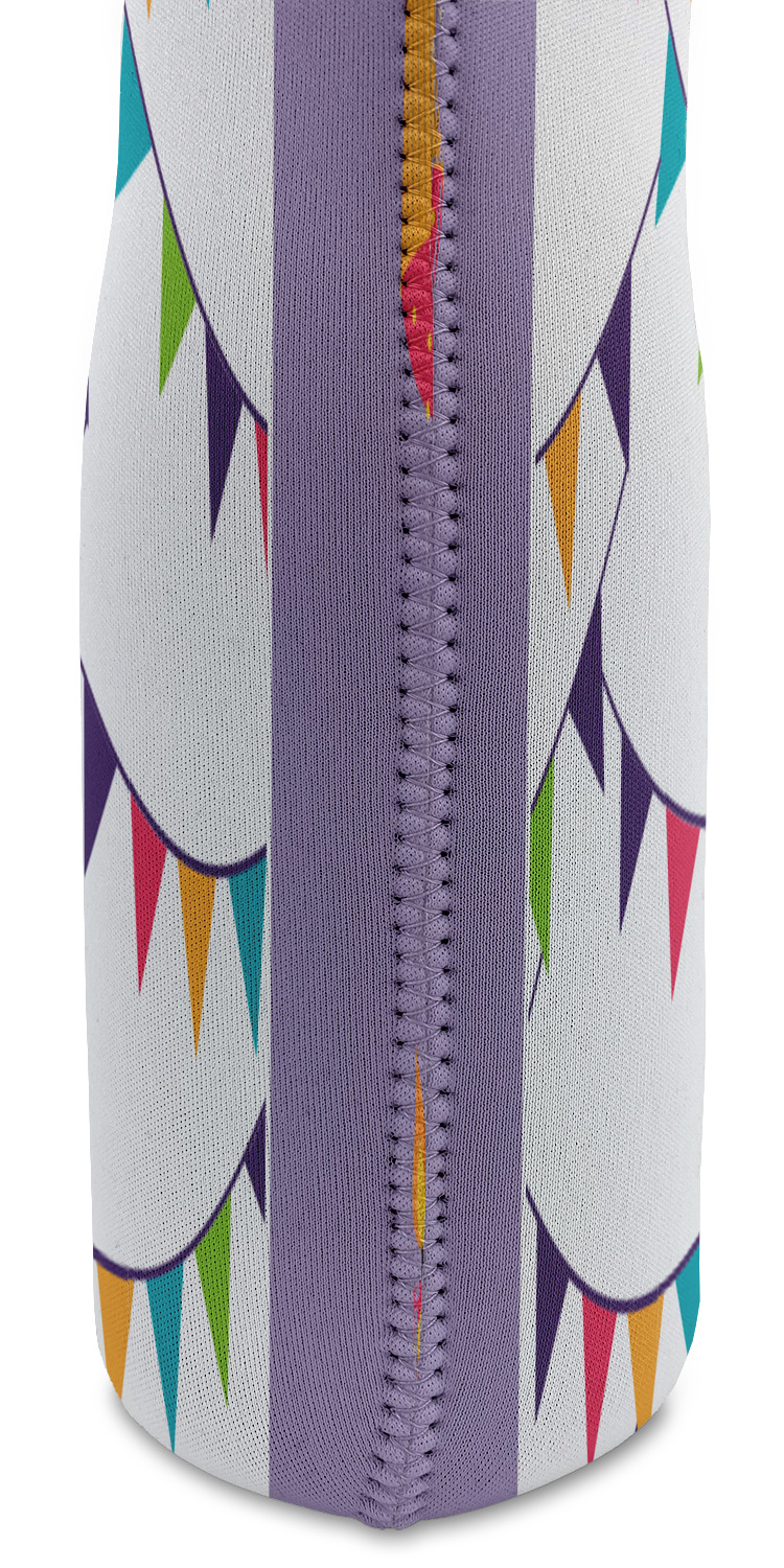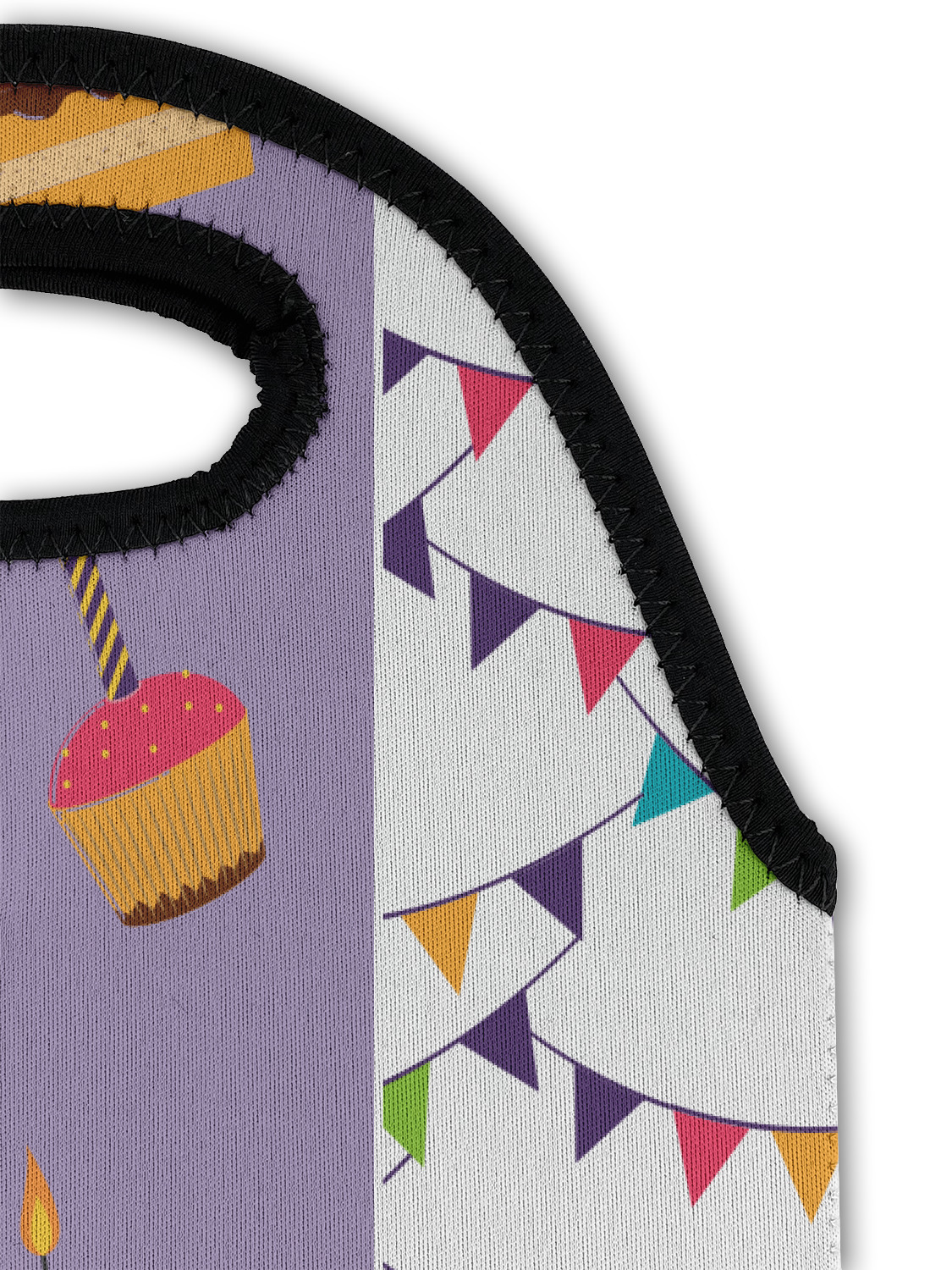 This design is filled with birthday party fun! The triangle birthday banners are a number of bright colors. Throughout the design you will find green, blue, yellow, pink, and mostly purple! The background is a fun lavender to contrast the pink cupcakes and yellow cake slices. This design in particular is divided up into three sections with two different patterns.