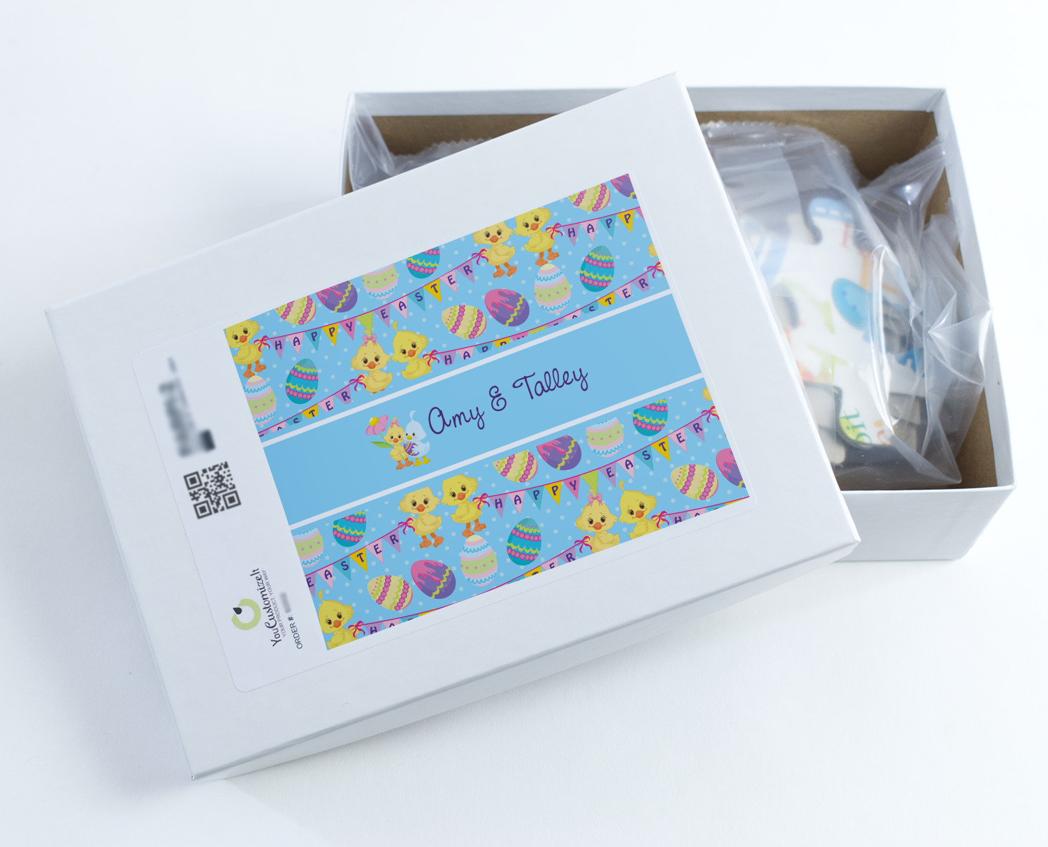We chose to create this design for two - so we used the boy & girl graphic (we have many more Easter graphics in our system) and their for personalization. We also chose light blue with polka dots for our background. You can change both the colors and the patterns.