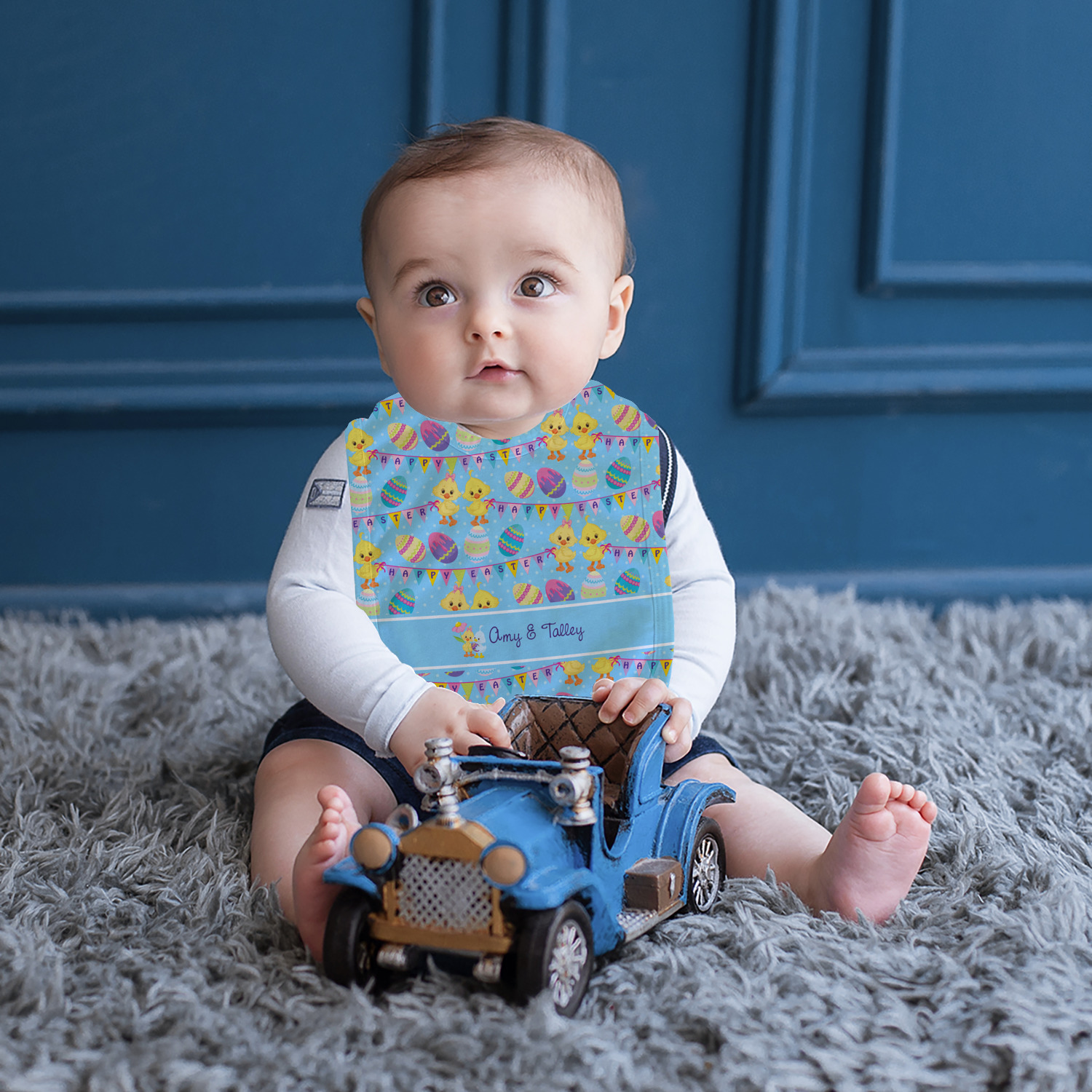 Made of soft polyester, each customizable bib hugs comfortably around the neck to catch every drip and drool. Each bib design is printed with baby-safe ink and finished with a secure stitch pattern and velcro clasp. We carry two customizable bib styles -Microfiber Velour and Jersey Knit.