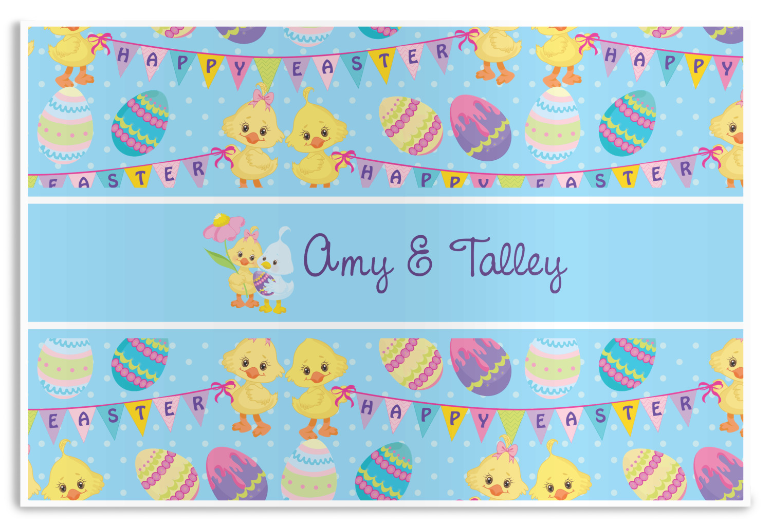 Our Happy Easter design is sure to put a big smile on your face. Easter eggs in beautiful pastel colors and chicks help create this happy Easter design. On the top we have chicks & holding up a "Happy Easter" banner and on the bottom with have chicks and Easter eggs on a light blue polka dot background.