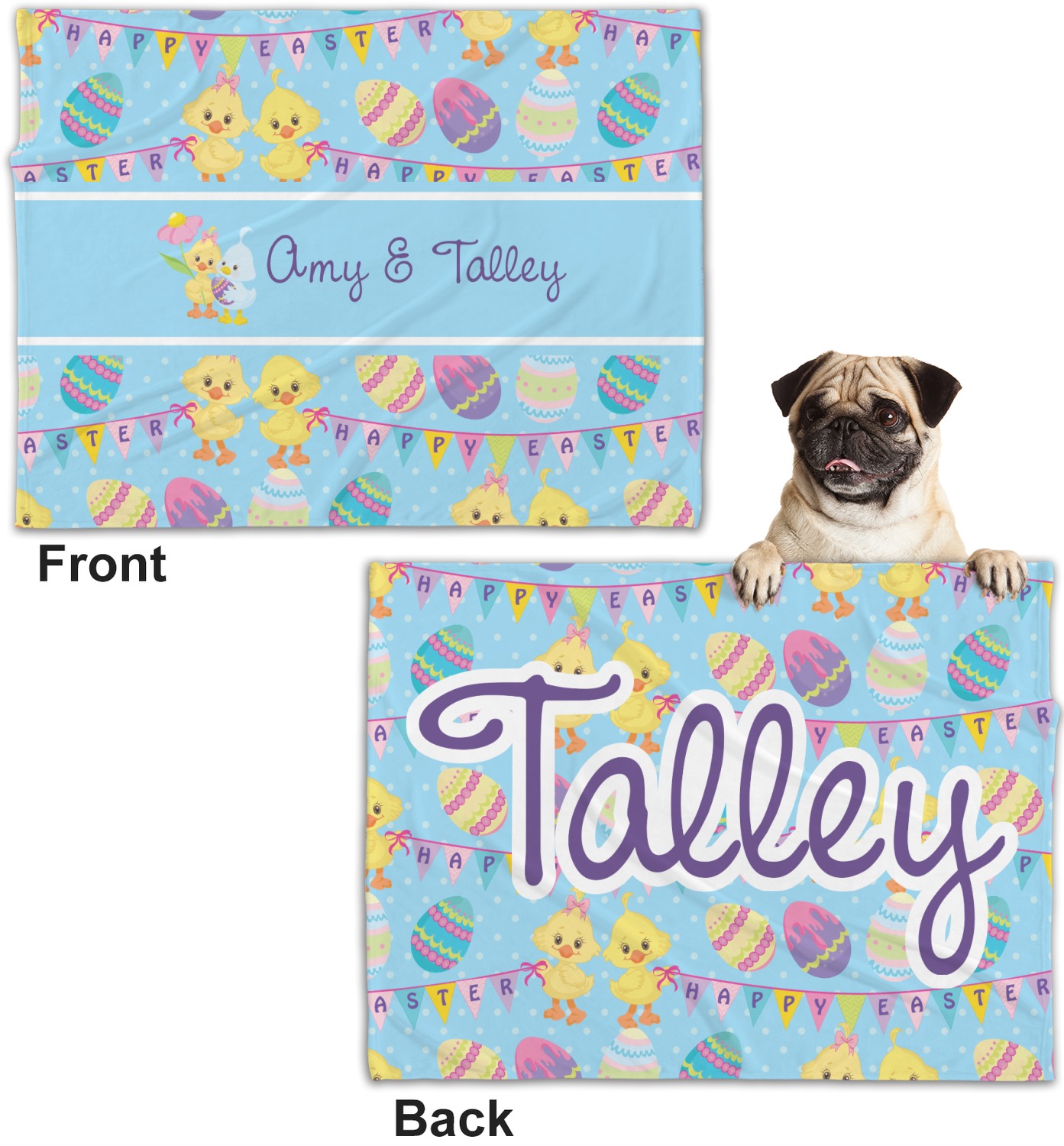 These dog blankets are crafted from a gentle, soft-to-the-touch, minky material. We print your customizations, either matching or differing, on both the top and underside of the blanket. These personalized dog blankets are available in two sizes: regular and large. Our regular size, at 40" x 30", accommodates small and some medium size dogs. At 60" x 50", our large dog blanket is a better fit for bigger breeds. Though specialized for dogs, these blankets still make a thoughtful gift for your favorite feline, or any other pet in mind!