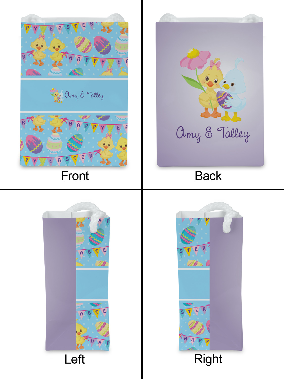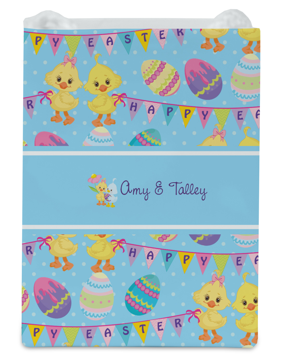 We chose to create this design for two - so we used the boy & girl graphic (we have many more Easter graphics in our system) and their for personalization. We also chose light blue with polka dots for our background. You can change both the colors and the patterns.