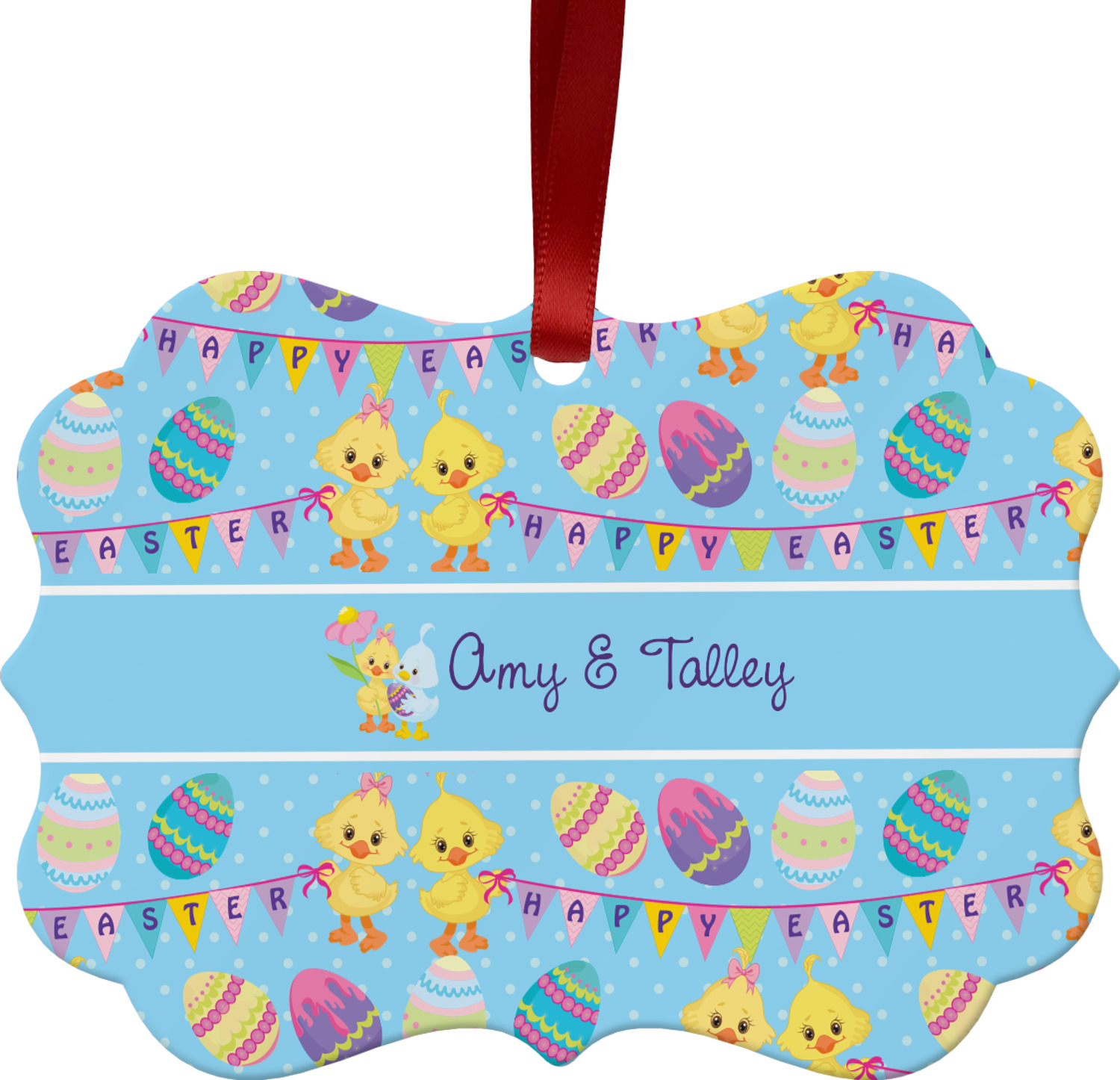 We chose to create this design for two - so we used the boy & girl graphic (we have many more Easter graphics in our system) and their for personalization. We also chose light blue with polka dots for our background. You can change both the colors and the patterns.