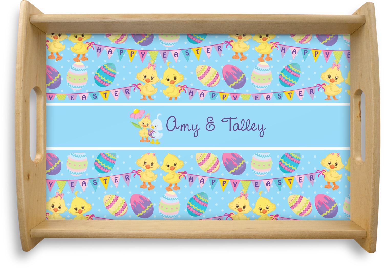 This serving tray with handles features square edges and two rounded sides, creating a very modern look. Each side is fabricated from a beautifully cut, natural wood. The bottom of the interior of the tray displays your customized design in bright, vibrant color. The tray is sold in both a black color and a natural wood look. Each variation of the wood serving tray has two sizes: Small, which is 14" x 10" x 2.25", and Large, which is 19.5" x 13.5" x 2.75".