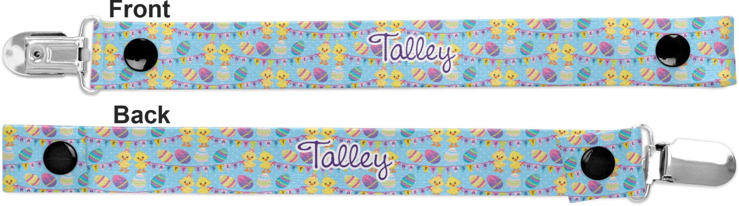 This personalized pacifier clip is the ideal size and measures at approximately 7.5 inches in length, when either end is snapped closed. On one end, you'll find a snap button. This button of your baby's pacifier holder is what can be attached to their pacifier to hold is securely in place. Simply open the snap, slip it through the pacifier opening, and snap it back into place. On the opposite end of this baby pacifier holder, you'll find a metal clip that can secure to a baby's collar or sleeve. This clip ensures that the strap stays in place, and that your baby's pacifier is always on hand.