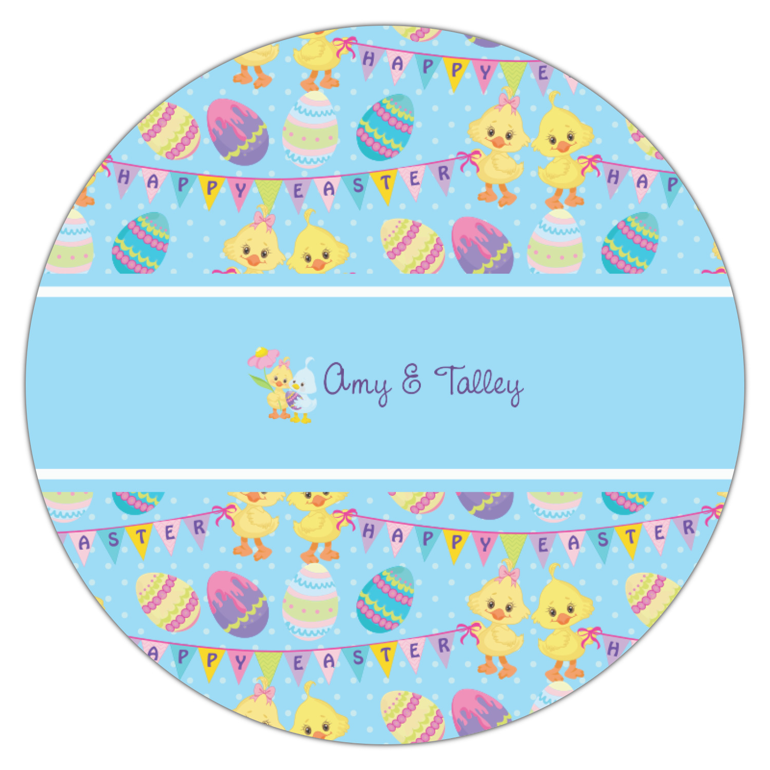 We chose to create this design for two - so we used the boy & girl graphic (we have many more Easter graphics in our system) and their for personalization. We also chose light blue with polka dots for our background. You can change both the colors and the patterns.