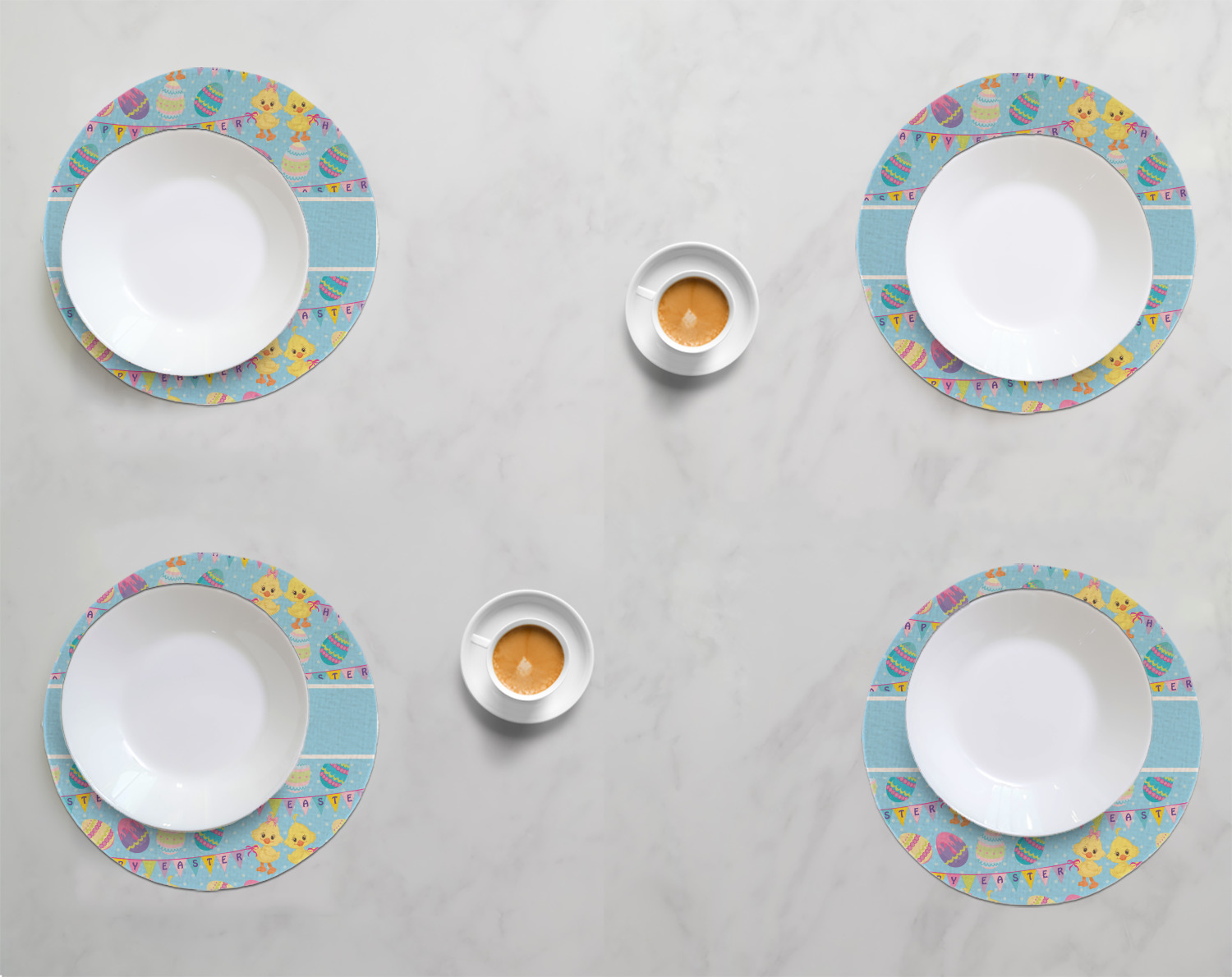 Our Happy Easter design is sure to put a big smile on your face. Easter eggs in beautiful pastel colors and chicks help create this happy Easter design. On the top we have chicks & holding up a "Happy Easter" banner and on the bottom with have chicks and Easter eggs on a light blue polka dot background.