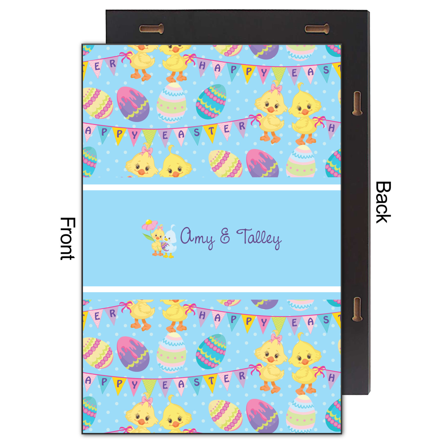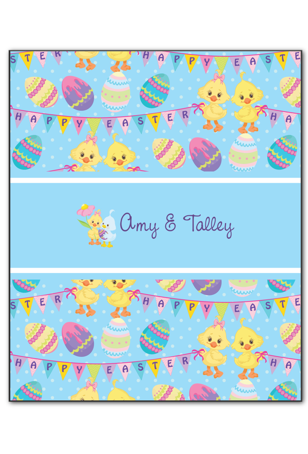 We chose to create this design for two - so we used the boy & girl graphic (we have many more Easter graphics in our system) and their for personalization. We also chose light blue with polka dots for our background. You can change both the colors and the patterns.