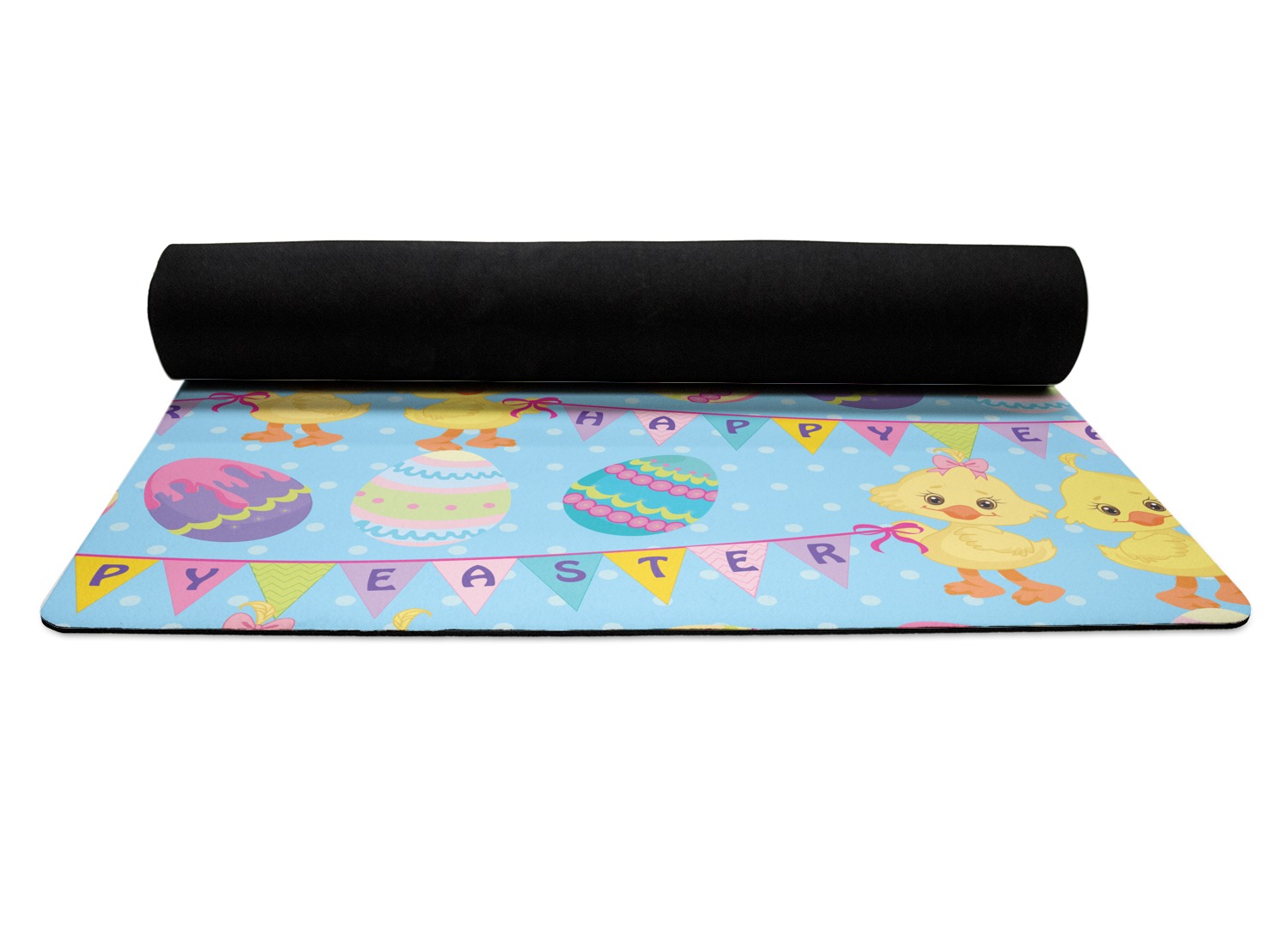 The top of the mats are dyed with your design using eco friendly non solvent inks. They have a smooth fleece felt top and feels very soft. The back of the mat is a sleek black and is a squishy non-slip texture to ensure that your mat does not slip on the floor. Our rubber backed mats are the perfect size at 68" x 24" and are just under approximately 1/4 inch thickness.