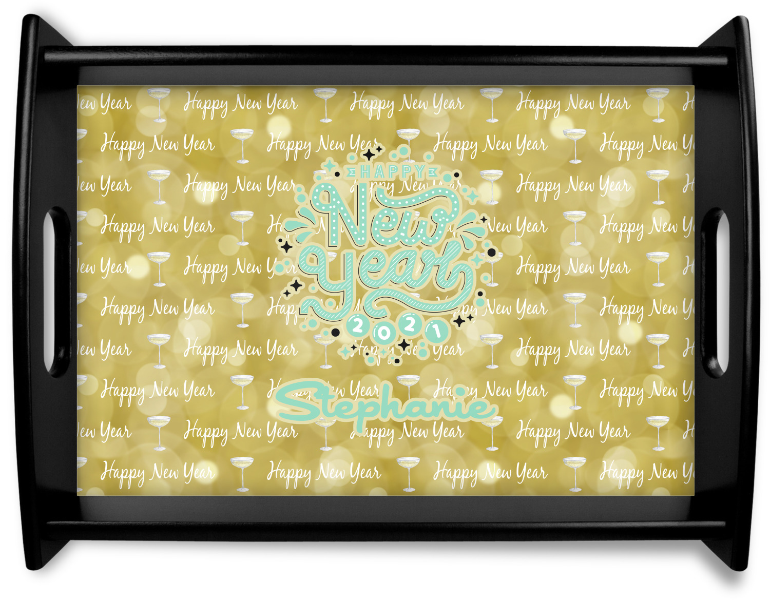 This serving tray with handles features square edges and two rounded sides, creating a very modern look. Each side is fabricated from a beautifully cut, natural wood. The bottom of the interior of the tray displays your customized design in bright, vibrant color. The tray is sold in both a black color and a natural wood look. Each variation of the wood serving tray has two sizes: Small, which is 14" x 10" x 2.25", and Large, which is 19.5" x 13.5" x 2.75".
