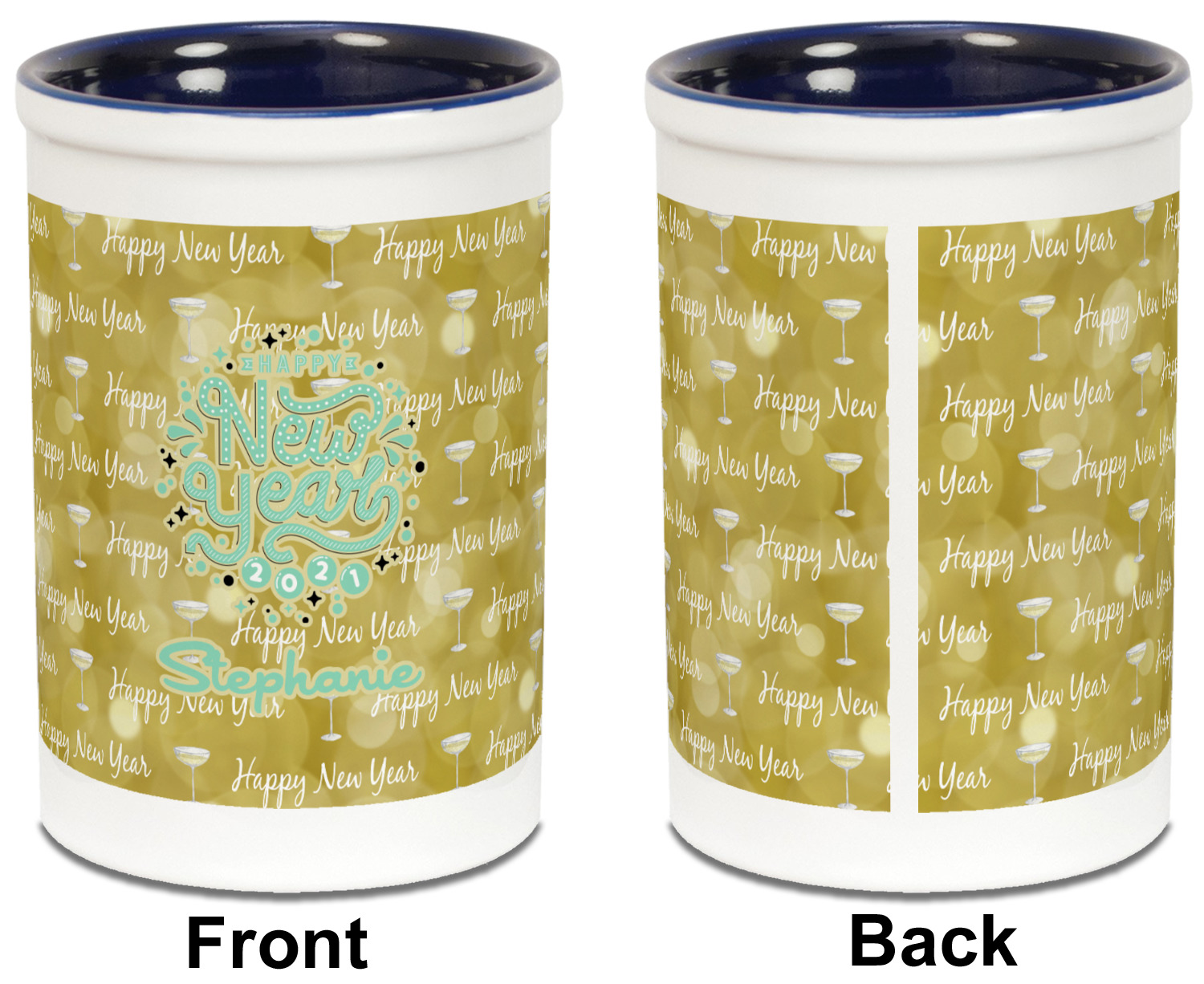Both the blue and black pencil holders are a ceramic material, giving you a sturdy and long-lasting pen and pencil holder. We print your designs on the exterior of the pencil cup, covering most of the outside surface. There is a small white border on the top and bottom of the exterior of the pen holder, setting apart your design from the interior's color. Our ceramic pen caddy is roughly 3.5" x 3.5" x 5" in dimensions.