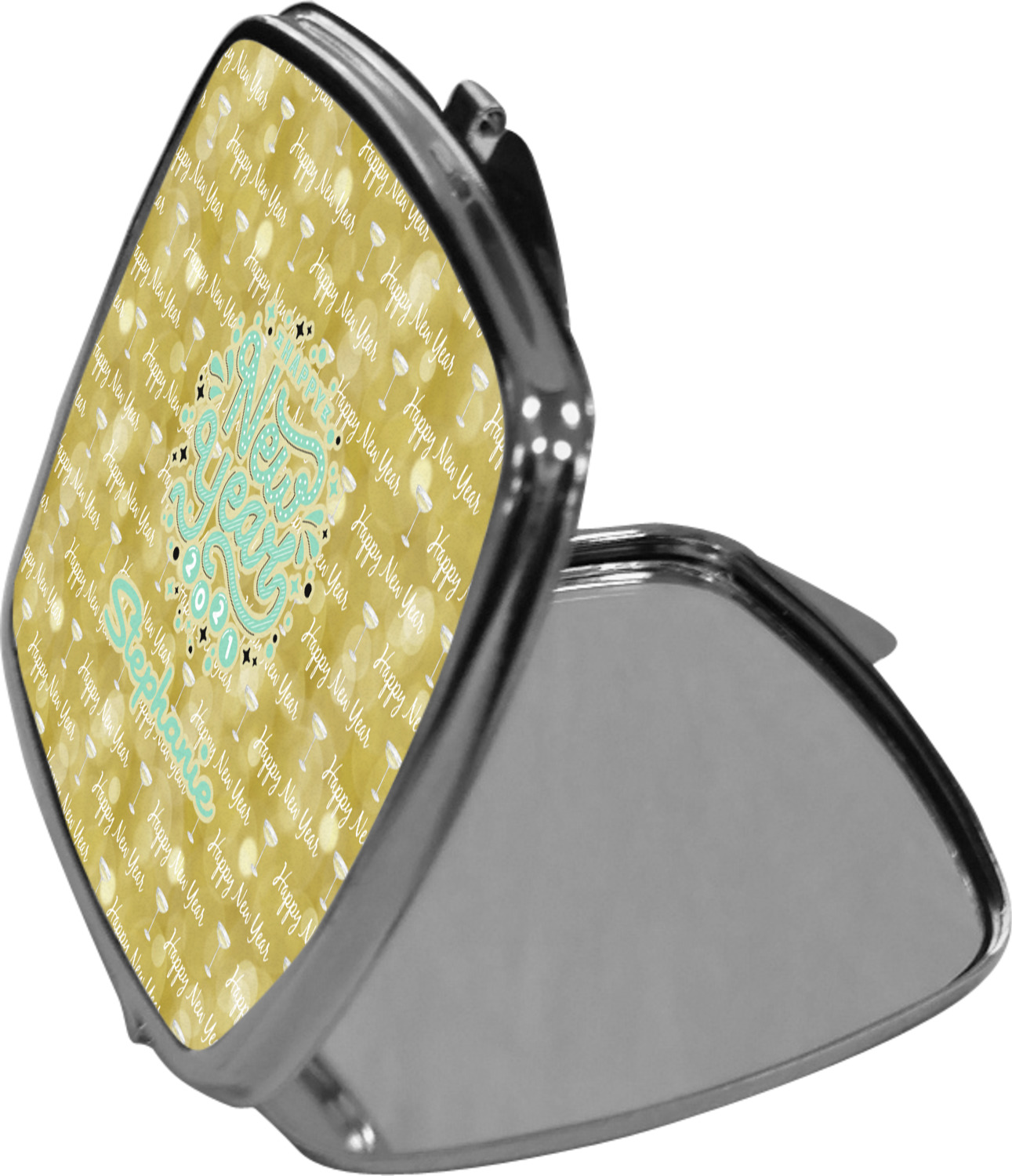 Our compact mirrors are customized with your design on one side. The other side is patterned silver tone metal. Inside, there are two mirrors.