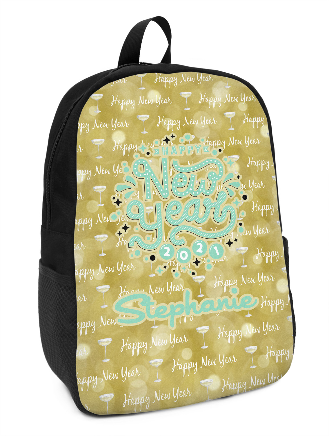 These small backpacks are made of a durable black canvas material with your personalization right on the front. The two shoulder straps are padded and easily adjustable. The bag itself measures at about 11" W x 15" H x 5" D. It's the perfect size for elementary aged kids or adults who want a smaller backpack. On the top of the bag you will find a handle to hang or carry your backpack by as well as a large zipper closure to keep all of your belongings safe inside. On each side of your backpack is a mesh pocket for a small item or water bottle. Inside your backpack you will find a spacious area with a small zipper pocket and a padded laptop slot that will fit up to a 13" laptop (13" being very snug). This is the perfect bag for any student that needs a couple books and their laptop with them at all times. It also works great as a carry on for traveling!
