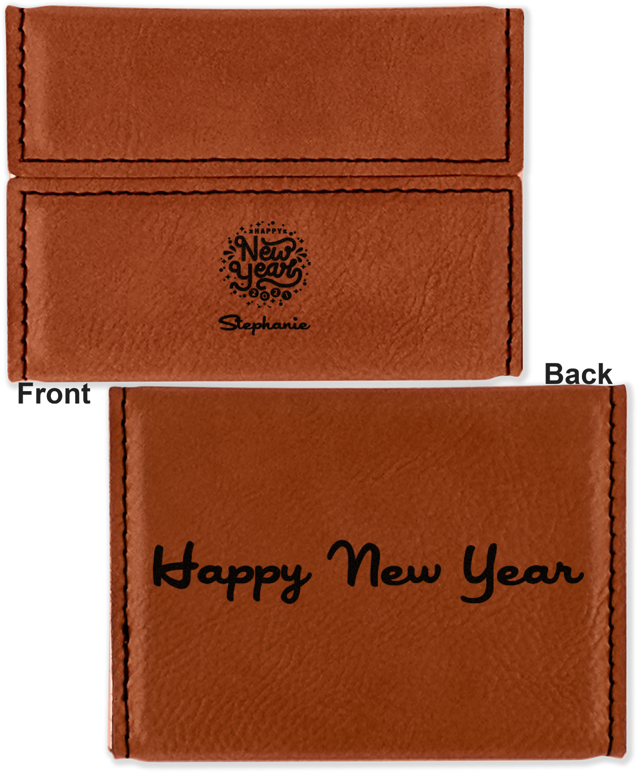 Your personalized design is laser engraved onto either the front, or the front and back of the card holder, depending on the model you purchase. Once engraved, the design will appear a darkened black against the cognac color of the leatherette.