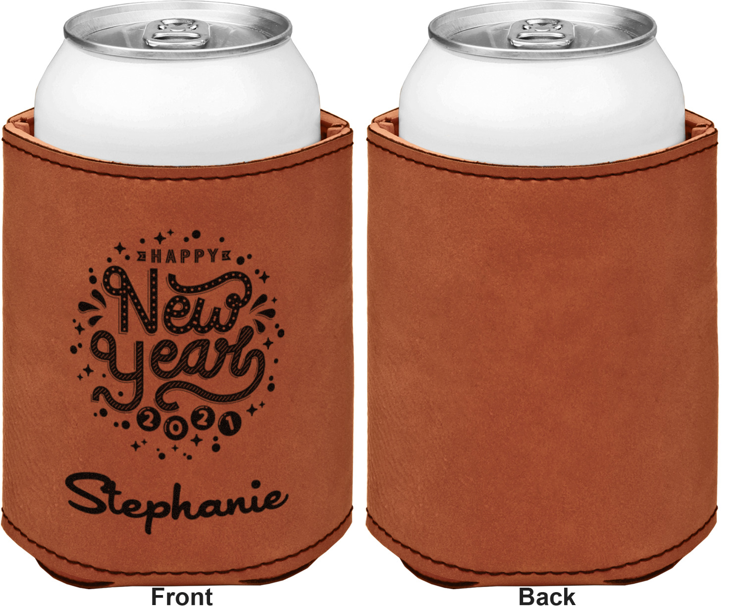 This can sleeve is made from a cognac-brown leatherette and stitched with a sturdy, black thread. A slim padding lines the inside of your can sleeve to allow for a better fit once your drink is inserted. The sleeve itself measures at 4 by 4.5 inches, allowing this custom can sleeve to accommodate most canned drinks. Your personalized design can be engraved on the front and back, or solely the front. When laser-engraved, your design appears as a black coloration which contrasts the leatherette nicely.