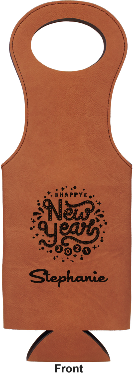 This wine carrier is made from a stunning leatherette, in a cognac-brown color. Strong, black stitching lines the sides of your wine bottle bag and provides extra durability. The interior is lined with a padded, black material to allow for a snug fit once your bottle is placed inside. At the top of this wine gift bag, you'll find two oval shaped handles that elegantly complements the rest of the bag's style. We provide you with the option of laser-engraving the front, or the front and back of your new personalized wine bag!