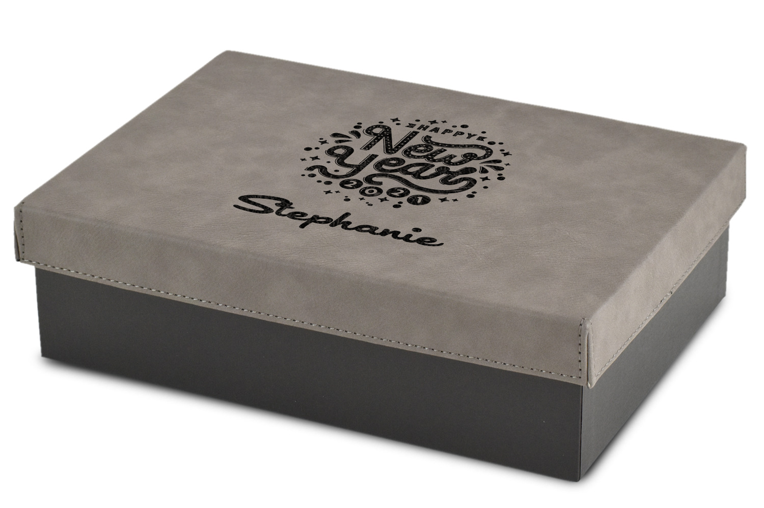These gift boxes are available in 3 different sizes to accommodate various sized gifts. Available in gray as a neutral color for any occasion as well as to showcase your design boldly. Engraved with a laser this high quality paper board and faux leather gift box is unique and makes any gift stand out.