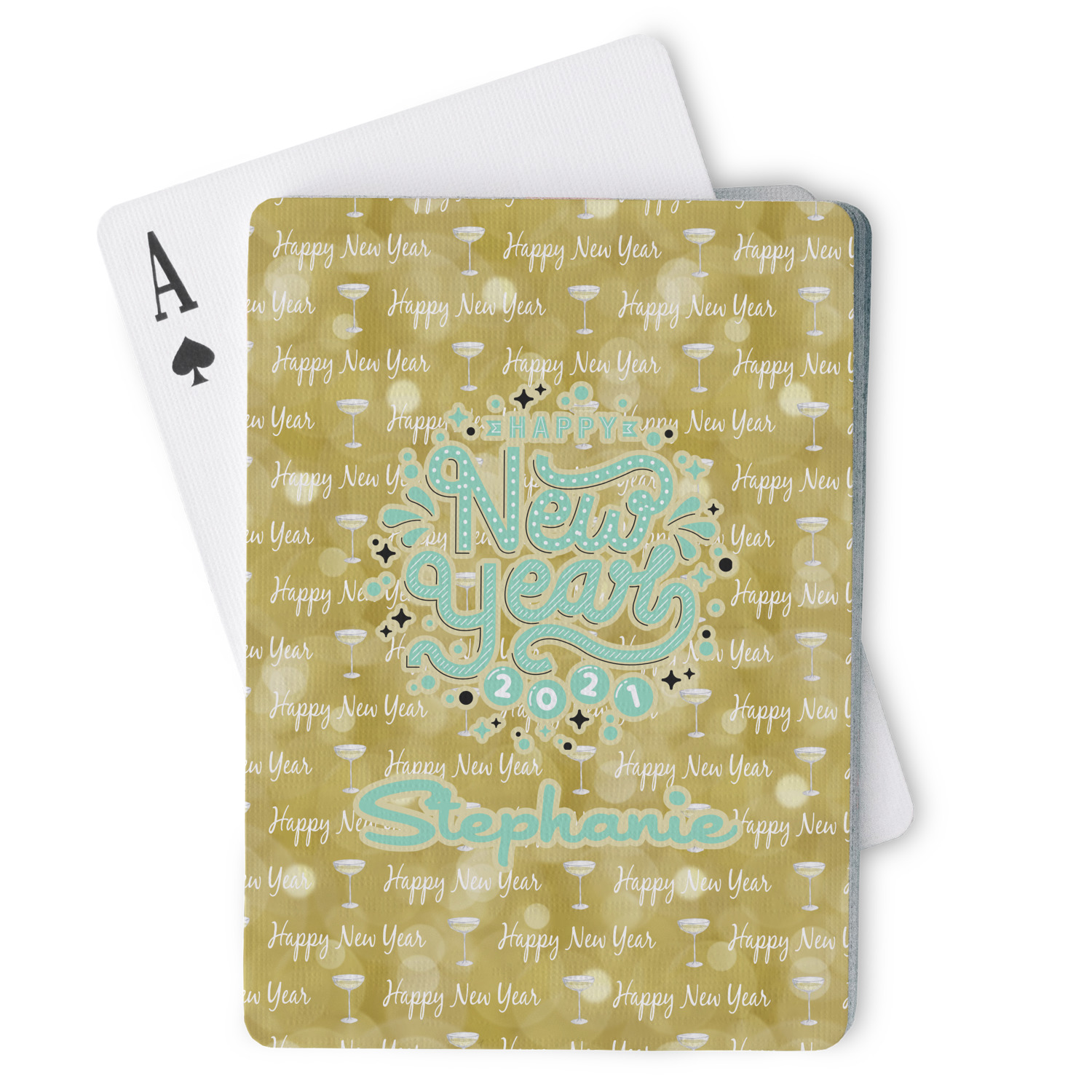 The customization / personalization is printed on the back side. The playing cards have a low gloss coating on both sides. The cards are packaged in a clear plastic box.